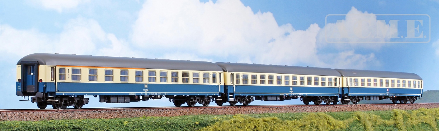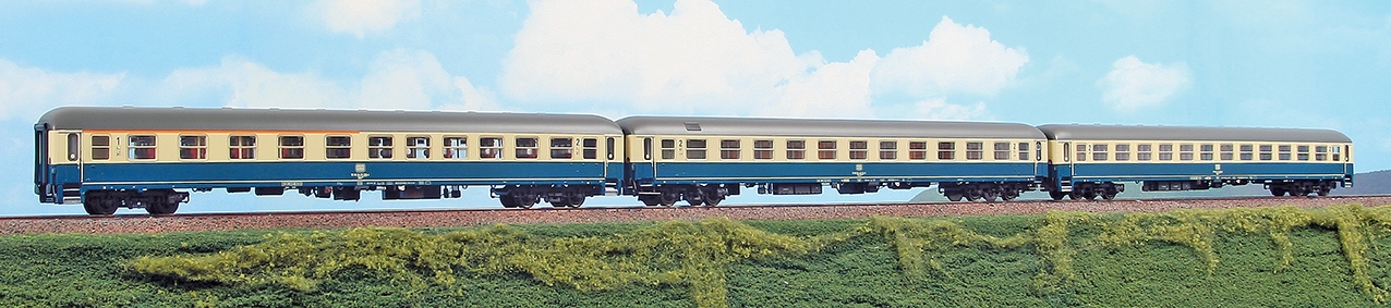 3-teilig mit einem Liegewagen Typ Bcmh 246, einem 1/2. Klasse Wagen Typ Abm 225, 2.Klasse Wagen Typ Bm 234alle Wagen in blau/beiger Lackierung"