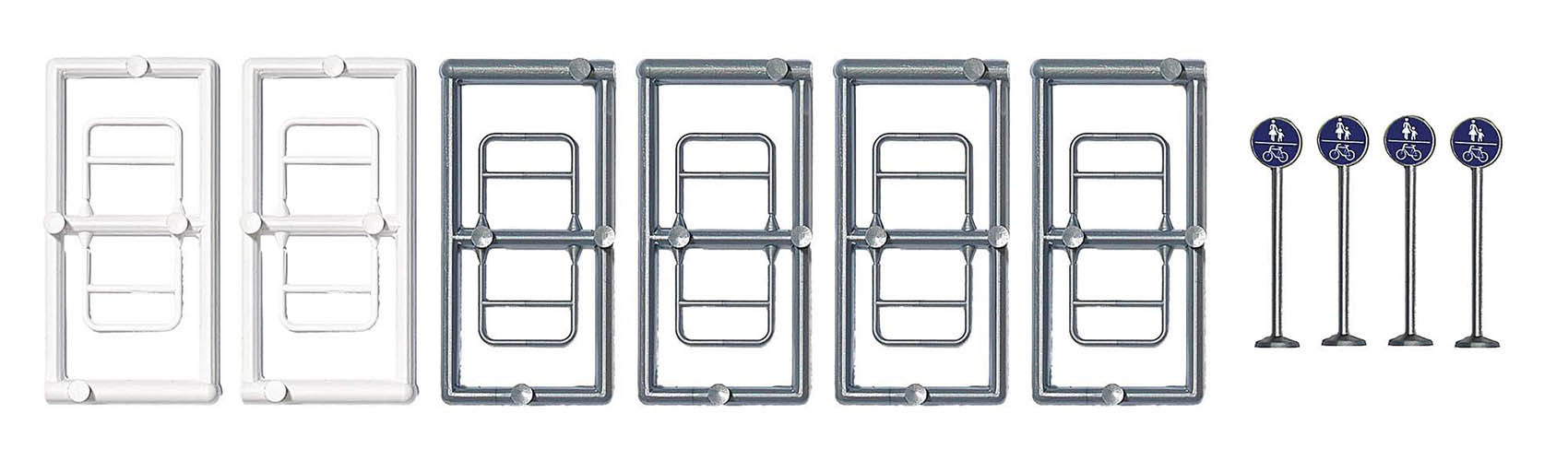 4 weiße Fahrradweg-Absperrungen zum selbst Bemalen und 8 graue Absperrungen als Fahrradständer. Mit 4 Verkehrsschildern für Fuß- und Radwege.