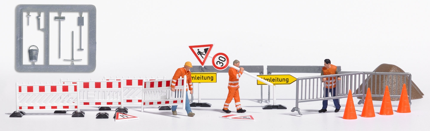 3 Straßenbauarbeiter in Arbeitskleidung der Epoche V. Mit verschiedenen Absperrungen, passenden Verkehrsschildern, Pylonen, Sandhaufen und Straßenbau-Werkzeugen.