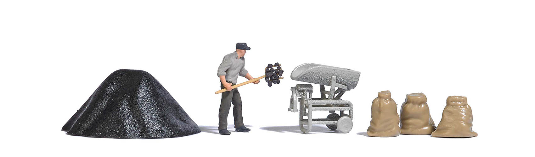 Mann, der mit einer Waage Kohlen abwiegt. Mit Kohlehaufen, 3 Kohlesäcken und 10 g Kohle.