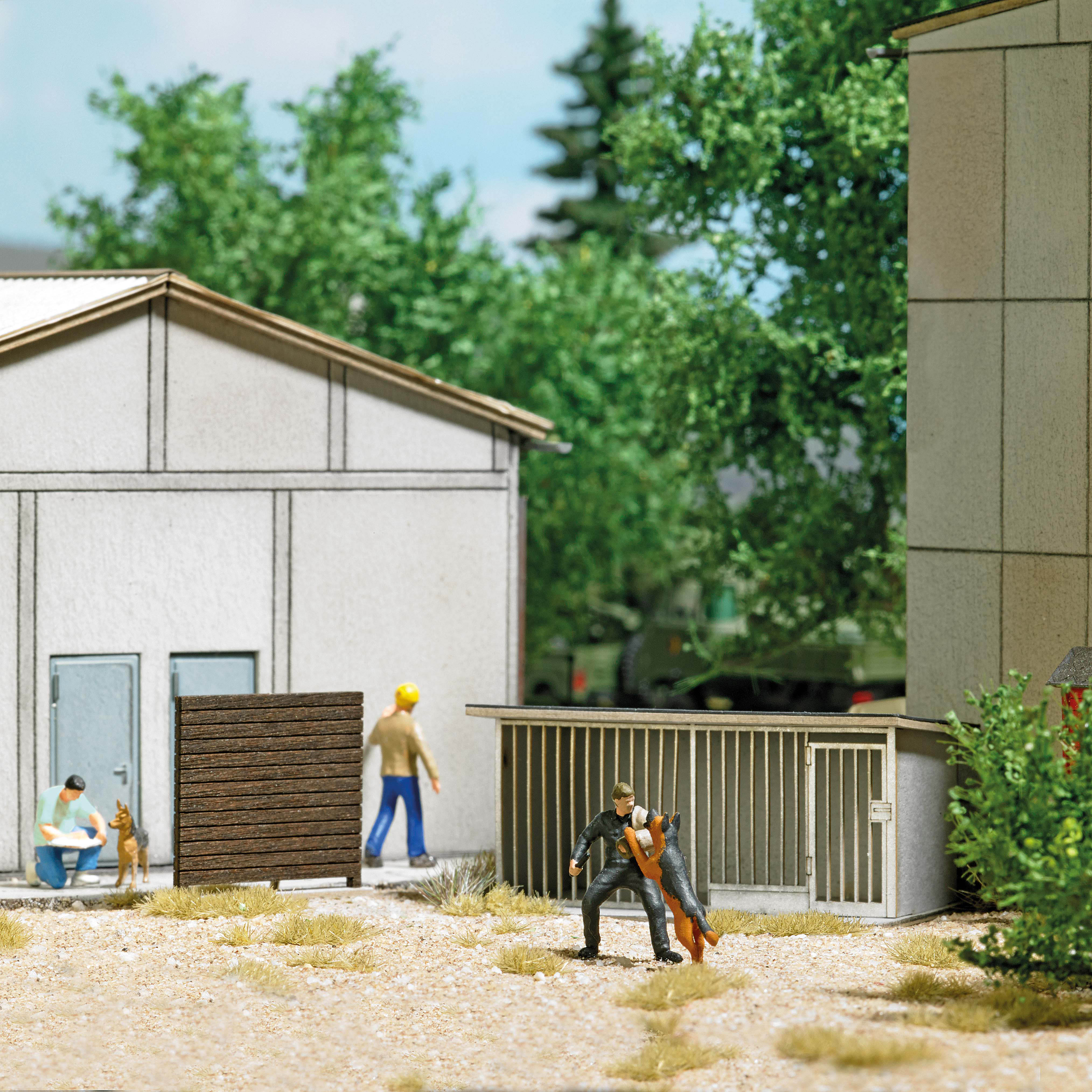 Set mit Schäferhund und Hundetrainer in Schutzkleidung. Mit Eskaladierwand aus echtem Holz und Hundezwinger