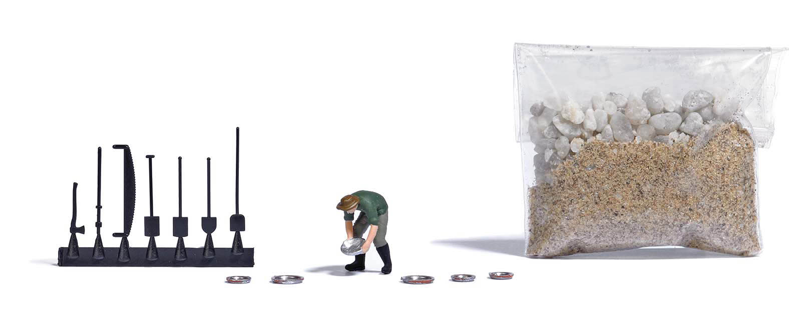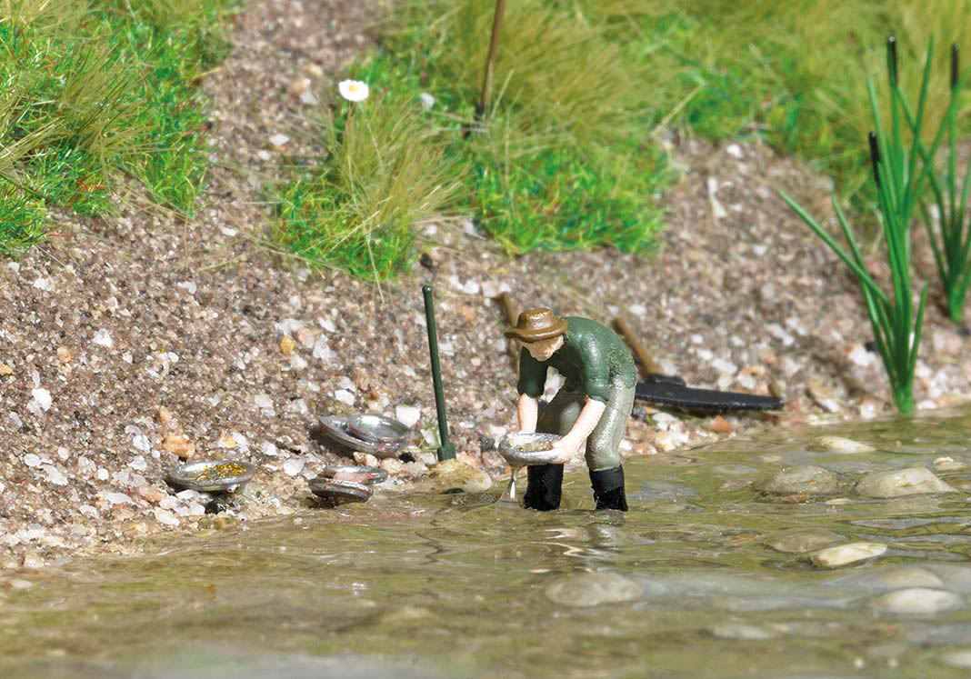 Action Set für die realistische Belebung Ihrer Modellwelt. Set mit Goldwäscher-Figur, Goldwaschpfannen, Schürfwerkzeug sowie Sand und Geröll.