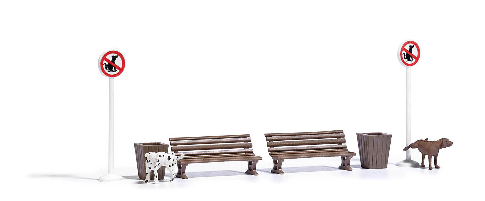 2 Pinkelnde Hunde mit gehobenem Bein. Mit Verkehrsschildern, Sitzbänken und Papierkörben für die realistische Gestaltung der Szene.