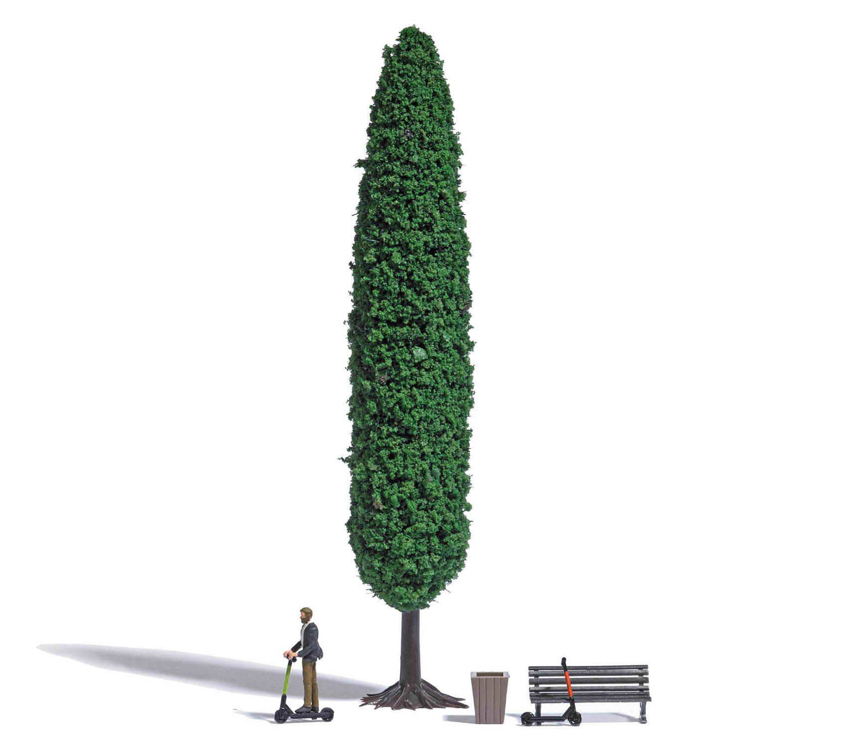 Zwei E-Scooter, einer davon mit Fahrer. Mit Parkbank, Papierkorb und Pappel.