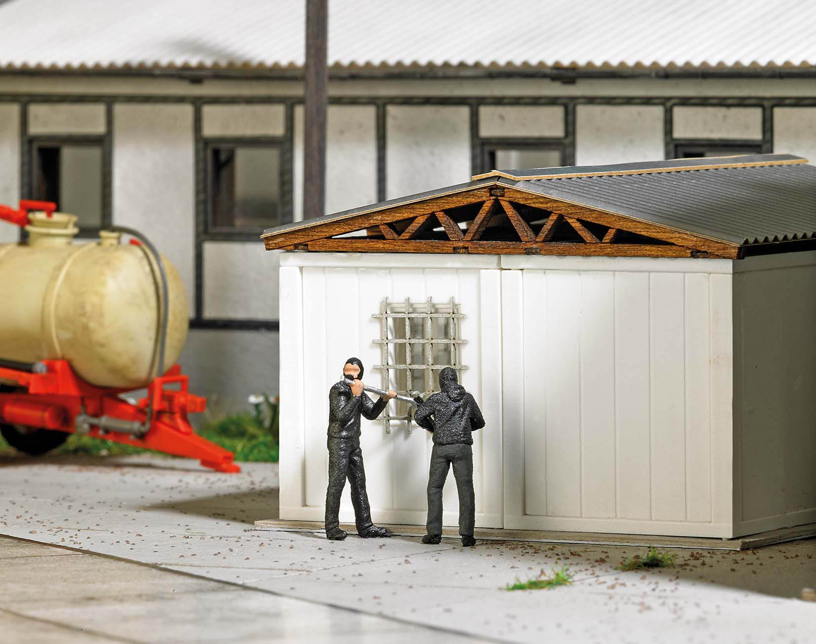 Zwei Einbrecher mit Einbruchswerkzeug bei der »Arbeit«. Mit 12 Fenstergittern zum Anbringen an Gebäuden. 4 Gitter 23 x 15 mm und 8 Gitter 14 x 12 mm.