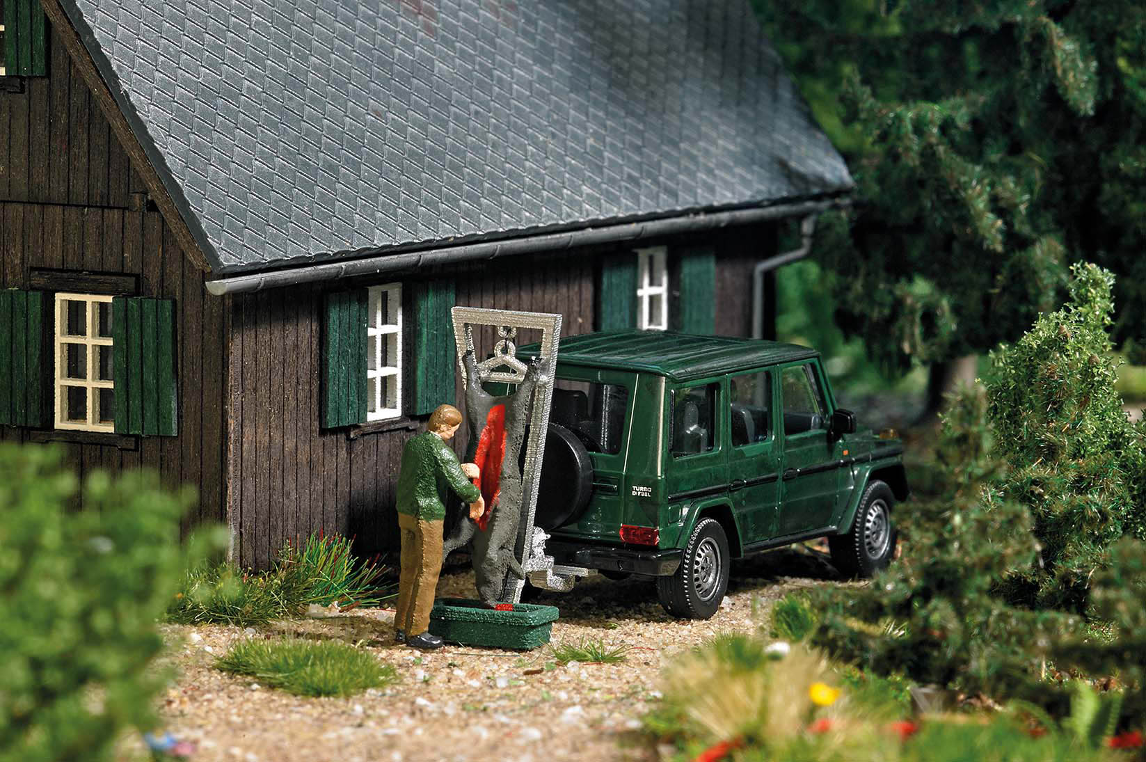 Set mit Mercedes-Benz G-Klasse Geländewagen, an dem eine Zerwirkhilfe zum Aufbrechen (Zerlegung in verwertbare Körperteile) des erlegten Wildes