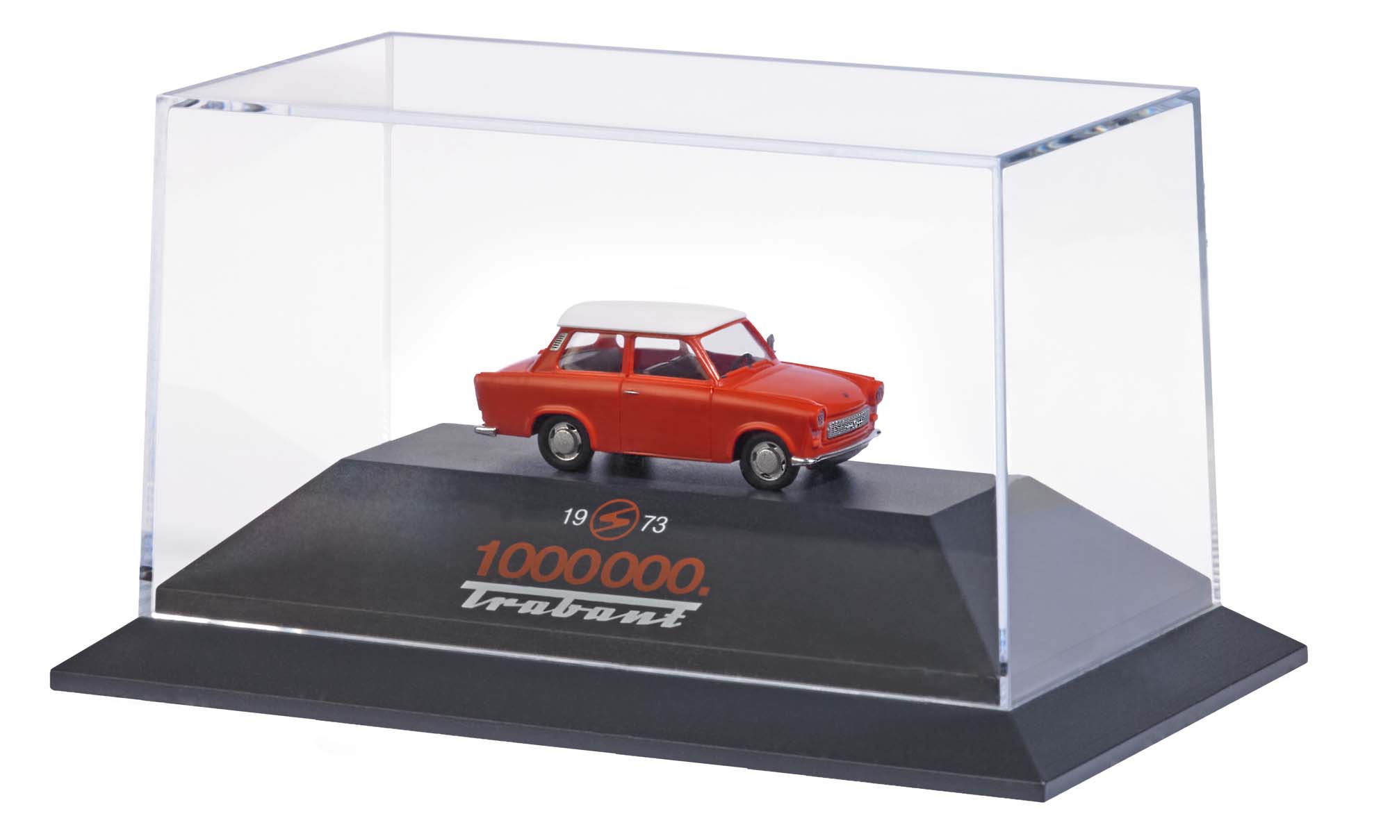 Das 1:87er Modell des kleinen Trabanten entspricht in seiner Ausführung zunächst den ersten Baujahren, die bis in die 70er Jahre ausgeliefert wurden. 1973, vor genau 50 Jahren lief der 1 Millionste Trabbi vom Band. Dieses besondere Fahrzeug in der Farbe Rot haben wir dem Anlass gebührend in eine extra Präsentationsbox mit speziellem Sockeldruck gepackt. Ein edles Sammlerstück der Automobilgeschichte.