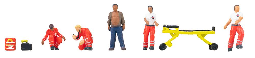 Mit Trage, Erste-Hilfe-Ausrüstung und großer Einsatzbereitschaft erreichen fünf Rettungssanitäter den Unfallort, sichern die Situation und kümmern sich um die Versorgung der Verletzten. Ob Verkehrsunfall, Baustellenunglück oder Rettung in letzter Minute – dieses Figurenset schafft realistische Einsatzmomente und verleiht jeder Stadtlandschaft mehr Leben und Dynamik.