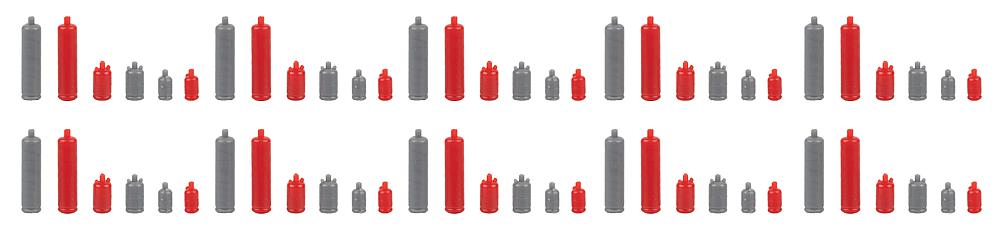 Sechzig Gasflaschen in drei verschiedenen Größen und zwei verschiedenen Farben.