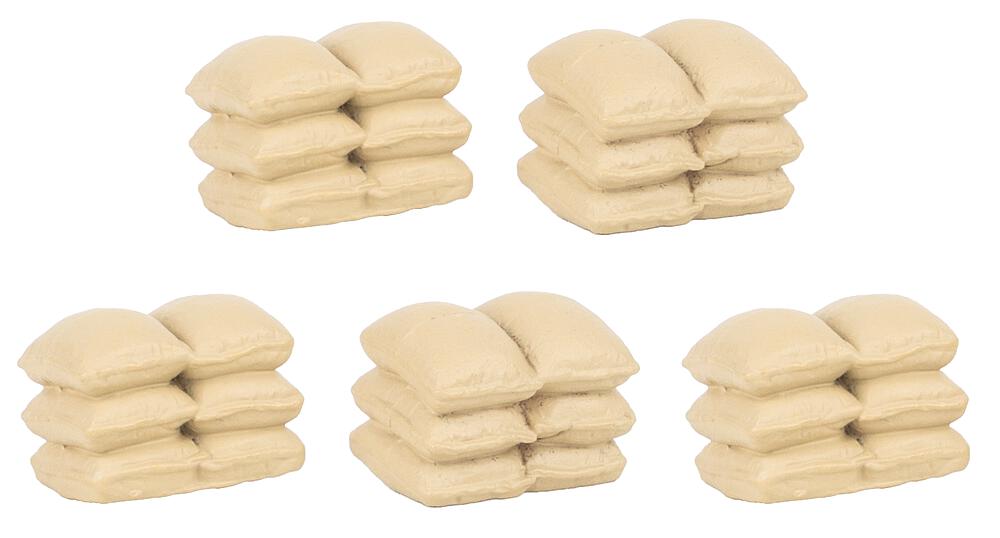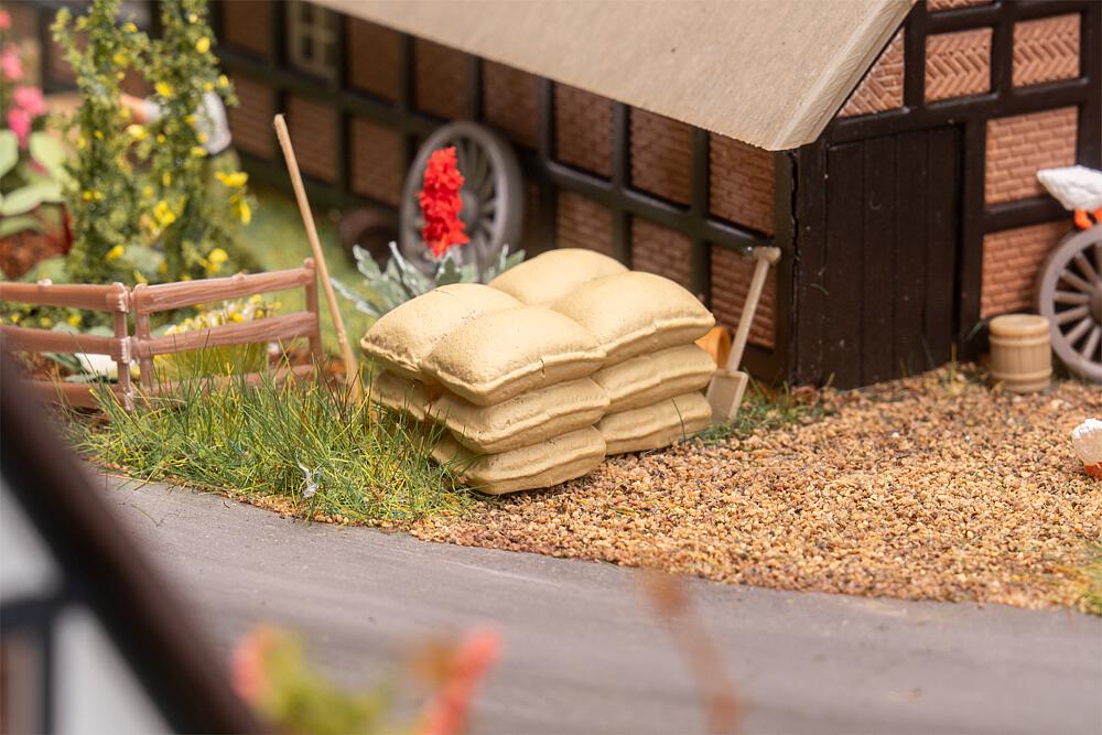 Ordnung muss sein! Fünf realistisch modellierte Stapel mit hellen Stoffsäcken eignen sich hervorragend zur Ausgestaltung von Lagerräumen, Güterhallen oder ländlichen Szenen. Ob Getreide, Mehl oder anderes Schüttgut – diese kleinen Details beleben die Modellwelt.