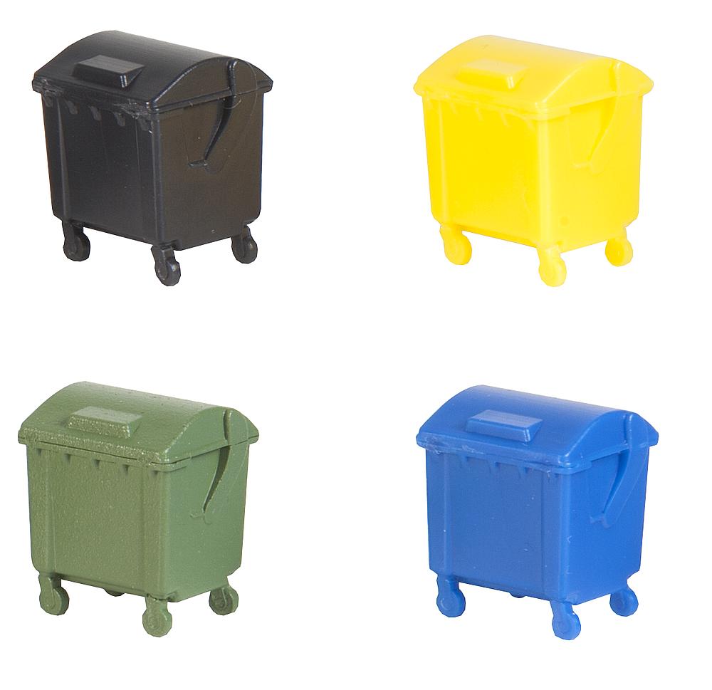 Mehrfarbiges Set bestehend aus acht großen Abfall- und Wertstoffbehältern aus Kunststoff mit vier Rädern und rundem Schiebedeckel.