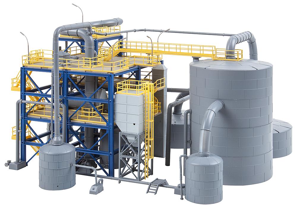 Megaplant im Mini-Maßstab. Produktionsanlage der chemischen Industrie, mit großem Tank und Reaktor, in dem der Einsatzstoff zu einem Produktgemisch reagiert, das anschließend durch unterschiedliche Siedepunkte in einer Kolonne getrennt wird. Verdampfte Flüssigkeiten und Gase werden über Wärmeaustauscher kondensiert und über Rohrleitungen zur Lagerung in Tanktassen geleitet, die als Auffangvolumen dienen. Die Lagerung und Bedienung von weiteren notwendigen Maschinen, Pumpen, Luftkühlern oder Kompressoren erfolgt in dem freistehenden, mehrgeschossigen Apparategerüst, das über Treppen und Steigleitern erschlossen wird. Der Bausatz ist modular erweiterbar, z.B. mit der Kolonne mit Rohrleitungen, Art. 130177. Bitte beachten Sie: Der Aufbau des Modells erfordert ein hohes Maß an Modellbauerfahrung. Dieser Bausatz enthält: 1019 Einzelteile in 6 Farben und 1 Bauanleitung.