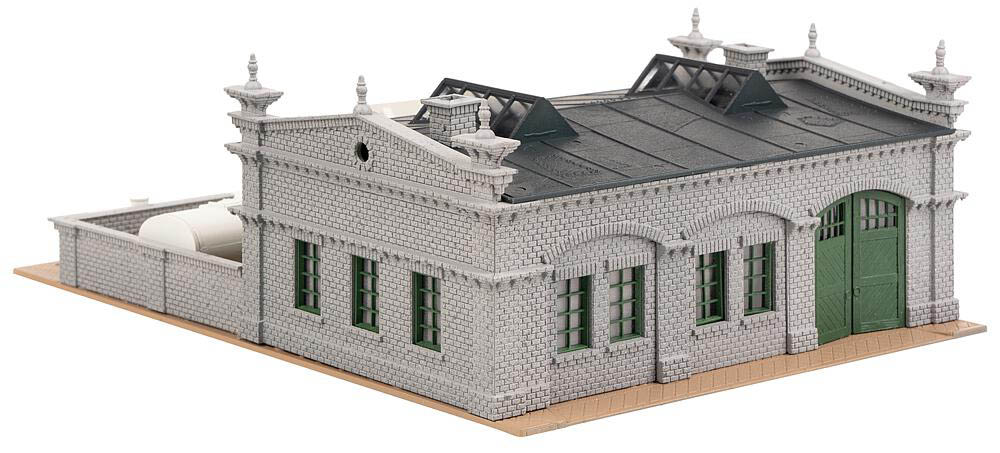 Große Werkstatt in Klinkerbauweise mit drei Toren, Ziergiebeln und einem ummauerten Vorhof.