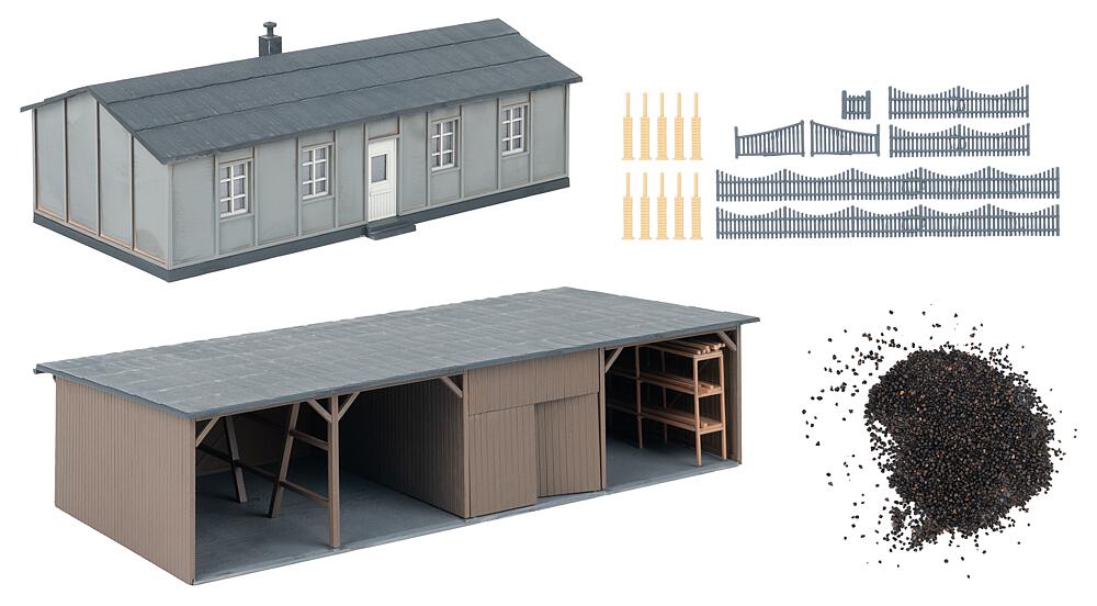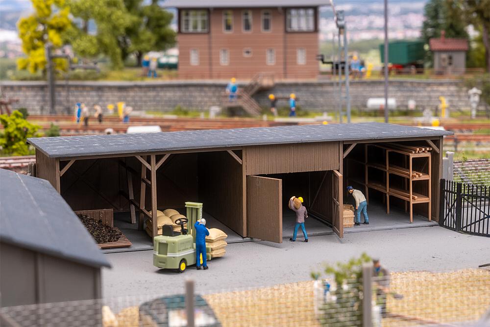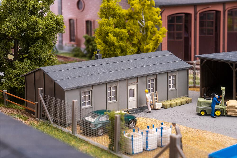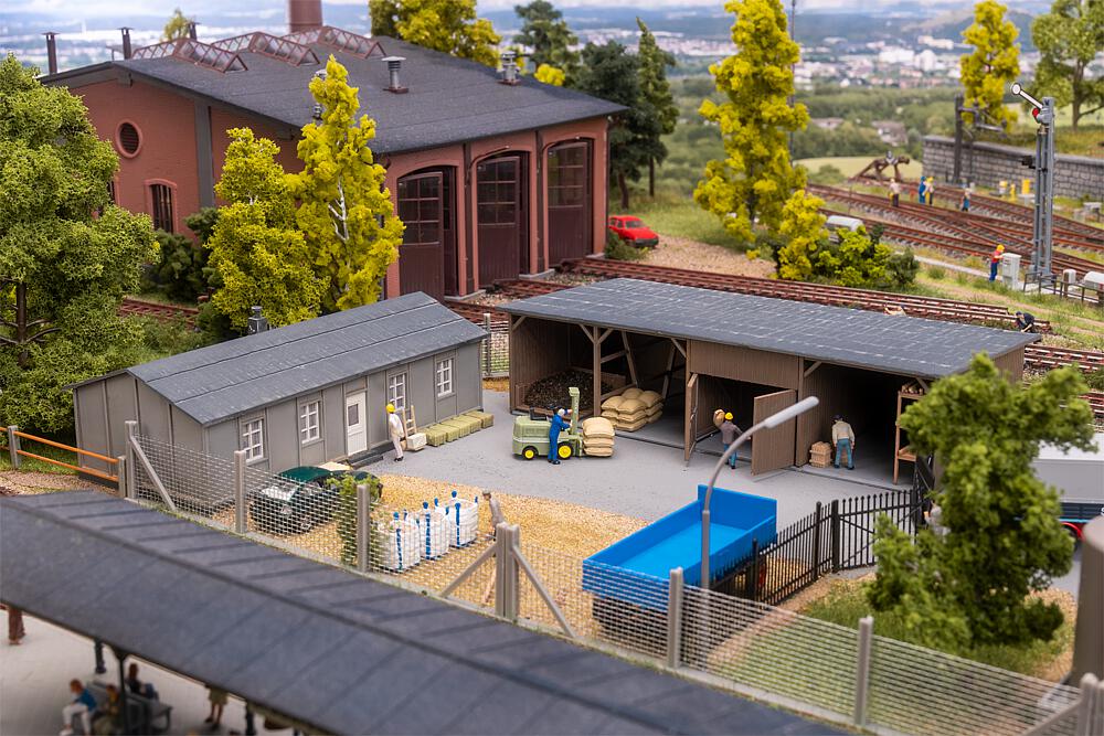 Ein authentisch gestalteter Lagerschuppen mit markantem gelbem Förderband bringt industrielles Flair auf die Modellbahnanlage. Perfekt zur Gestaltung von Verladezonen oder Lagerbereichen – ein Beutel mit Streumaterial ist im Bausatz enthalten.