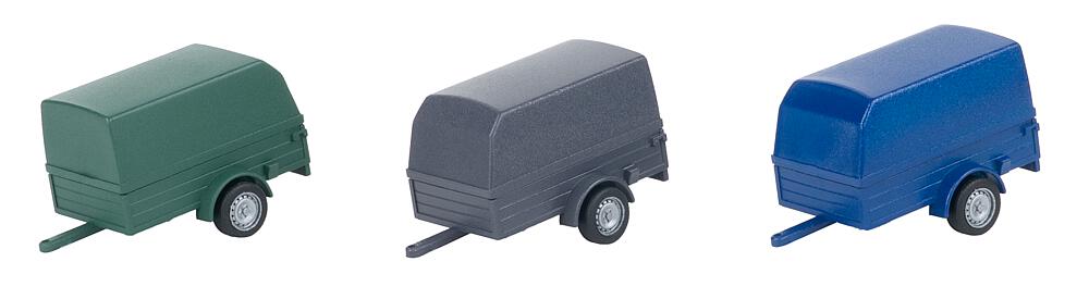 Drei Auto-Anhänger in verschiedenen Farben – perfekt zum Ausgestalten von Lade- oder Parkplätzen.