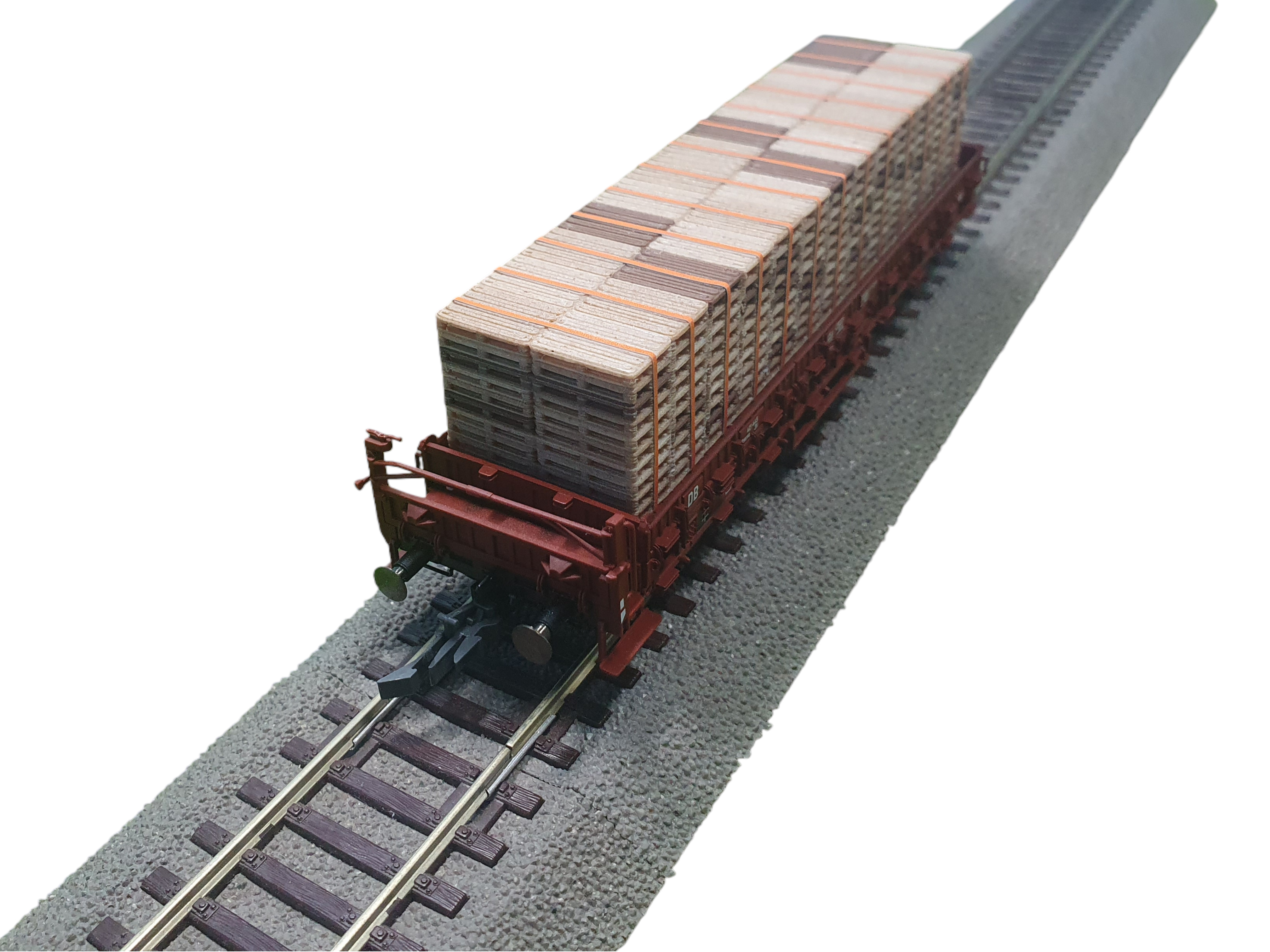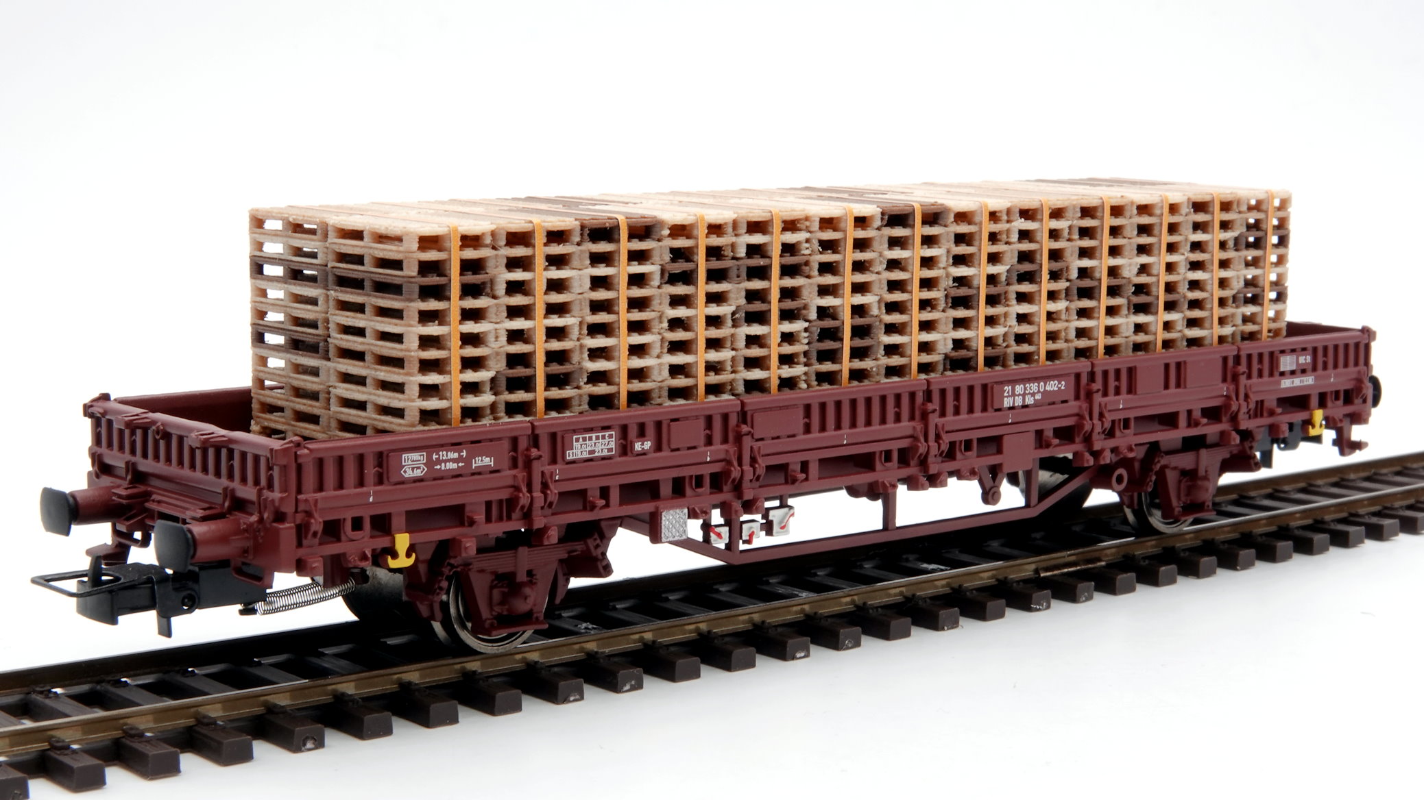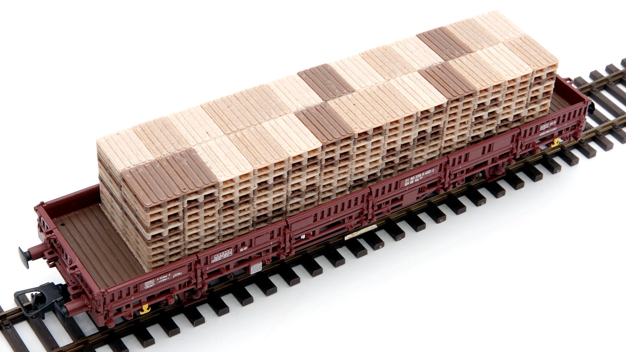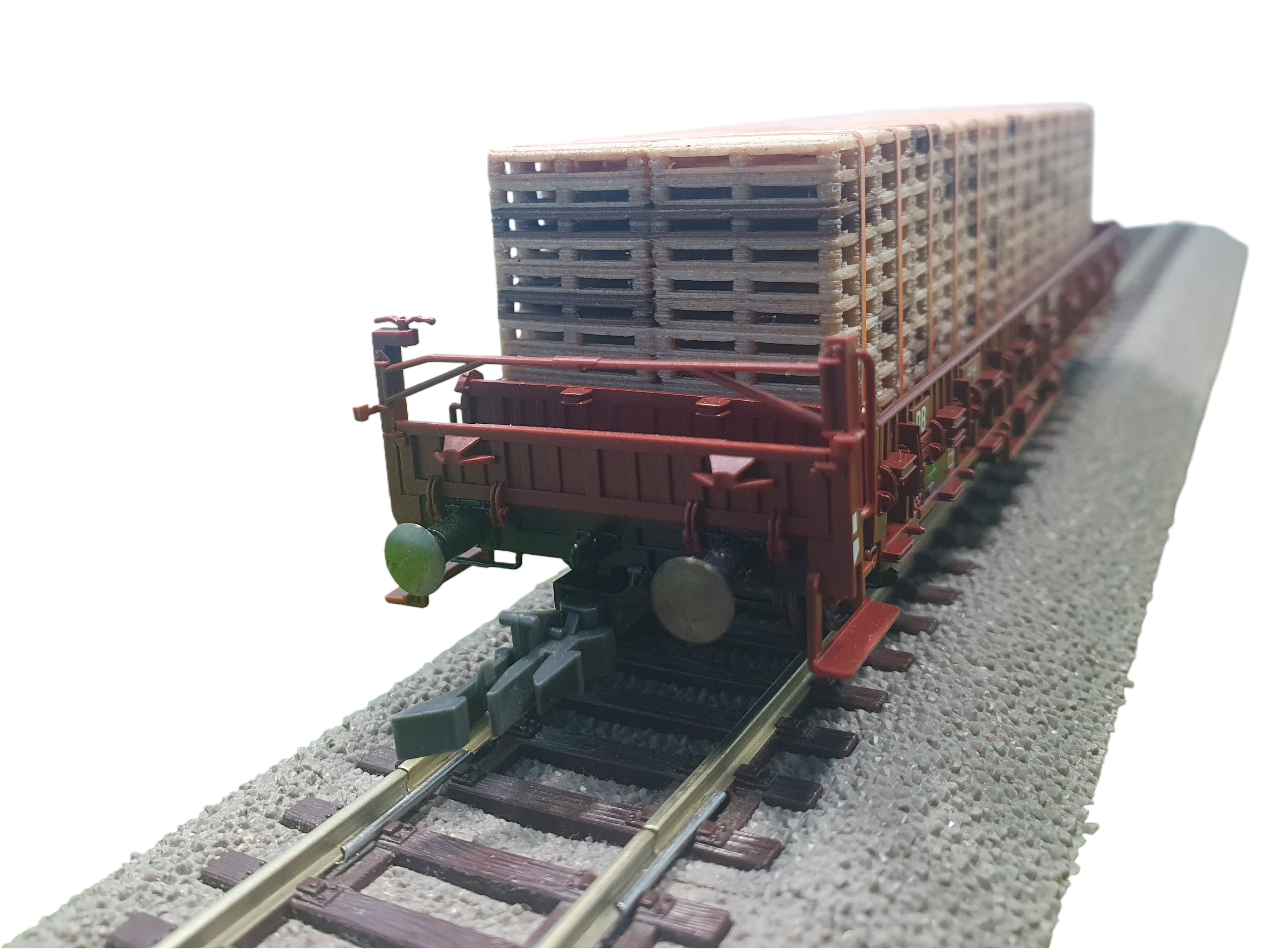 Palettenstapel in drei Holztönen für besonders realistische Wirkung: gesamt 260 Europaletten gestapelt mit Zurrbändern fertig montiert