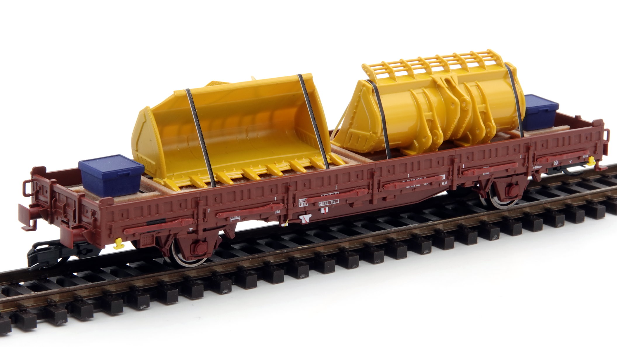 TT Ladegut – zwei gelbe Baggerschaufeln mit zwei blauen Werkzeugboxen und schwarzen Zurrgurten auf Holzrahmen (Nachbildung)