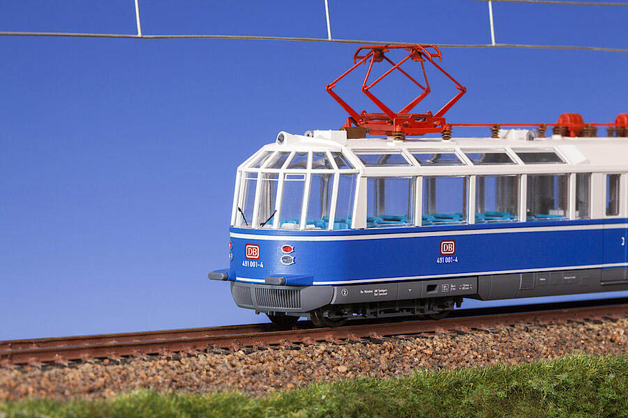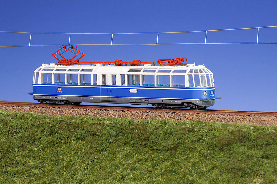 Das Vorbild:Anfang der 1930er Jahre ließ die Deutsche Reichsbahn insgesamt 5 besondere Aussichttriebwagen bauen, bei denen durch entsprechende wagenbauliche Gestaltung gute Sichtverhältnisse von allen Plätzen geschaffen wurden. Zwei dieser Triebwagen wurden für den elektrischen Betrieb eingerichtet, die drei anderen hatten dieselhydraulischen Antrieb. Die beiden elektrischen Aussichtstriebwagen wurden 1933 für die Reichsbahndirektion München in Auftrag gegebenund 1935 mit den Betriebsnummern elT 1998 und 1999 geliefert. Hersteller waren die Heidelberger Waggonfabrik Fuchs (wagenbaulicher Teil) und die AEG Berlin (elektrische Ausrüstung). 1940 erfolgte eine Umnummerierung in ET 91 01 und ET 91 02. Der nur kurz im Einsatz gewesene ET 91 02 brannte nach einem Bombenangriff auf München im Bw München Hbf aus und wurde am 9. Juli 1943 ausgemustert. Der Einsatzbereich des verbliebenen ET 91 01, welcher ab 1. Januar 1968 seine dritte und letzte Betriebsnummer 491 001-4 erhielt, blieb auf das verhältnismäßig kleine elektrisch betriebene Streckennetz in Süddeutschland und Österreich beschränkt. Erst in den folgenden Jahrzehnten wurden immer mehr Strecken bei der Deutschen Bundesbahn elektrifiziert; dies erweiterte die Einsatzmöglichkeiten auch Richtung Norden. Neben immer weiteren Zielen für Tagesfahrten kamen auch mehrtägige Touristikfahrten hinzu. Auch auf den elektrifizierten Strecken der Schweizerischen Bundesbahnen sowie vielen schweizerischen Privatbahnen konnte der Gläserne Zug ohne große Schwierigkeiten eingesetzt werden. Bis 1995 kam der Gläserne Zug auch in alle 5 neuen Bundesländer sowie am 22.05.92 über Bad Schandau nach Decin in die damalige Tschechoslowakei. Im Laufe seiner 60jährigen Dienstzeit hat sich neben geringfügigen technischen Veränderungen, z.B. bei der elektrischen Dachausrüstung, den Stirnlampen und dem Schürzenbereich, hauptsächlich sein Aussehen durch verschiedene Anstriche auffallend verändert. Durch einen Unfall am 12. Dezember 1995 kam dann sein vorläufiges Aus. Seit der Überführung zum Bahnpark Augsburg wurde sich hier um die museale Aufarbeitung gekümmert. Technische Ausstattung:- Länge über Puffer: 172 mm- Gewicht: 72 g- System: 2-Leiter Gleichstrom- Betriebsspannung: max. 12V Gleichspannung- kleinster fahrbarer Radius: 286 mm- fahrtrichtungsabhängiges Spitzen- und Schlusslicht, Innenbeleuchtung warmweiß- 6polige Digitalschnittstelle gemäß NEM 651, steckbar- Haftreifen: 2 Stück auf dem angetriebenen Drehgestell Oberleitungsbetrieb möglich, Dachstromabnehmer sind elektrisch nutzbar (siehe Montage-Anleitung in der Gebrauchs-Information) Mit dem zum Lieferumfang gehörenden NEM-Schacht und den austauschbaren Radsätzen ohne Ritzel kann das Modell auch als Anhänger betrieben werden. Somit kann der Betrieb auf einer nicht elektrifizierten Strecke, z.B. mit einer vorgespannten Diesellok, nachgebildet werden.