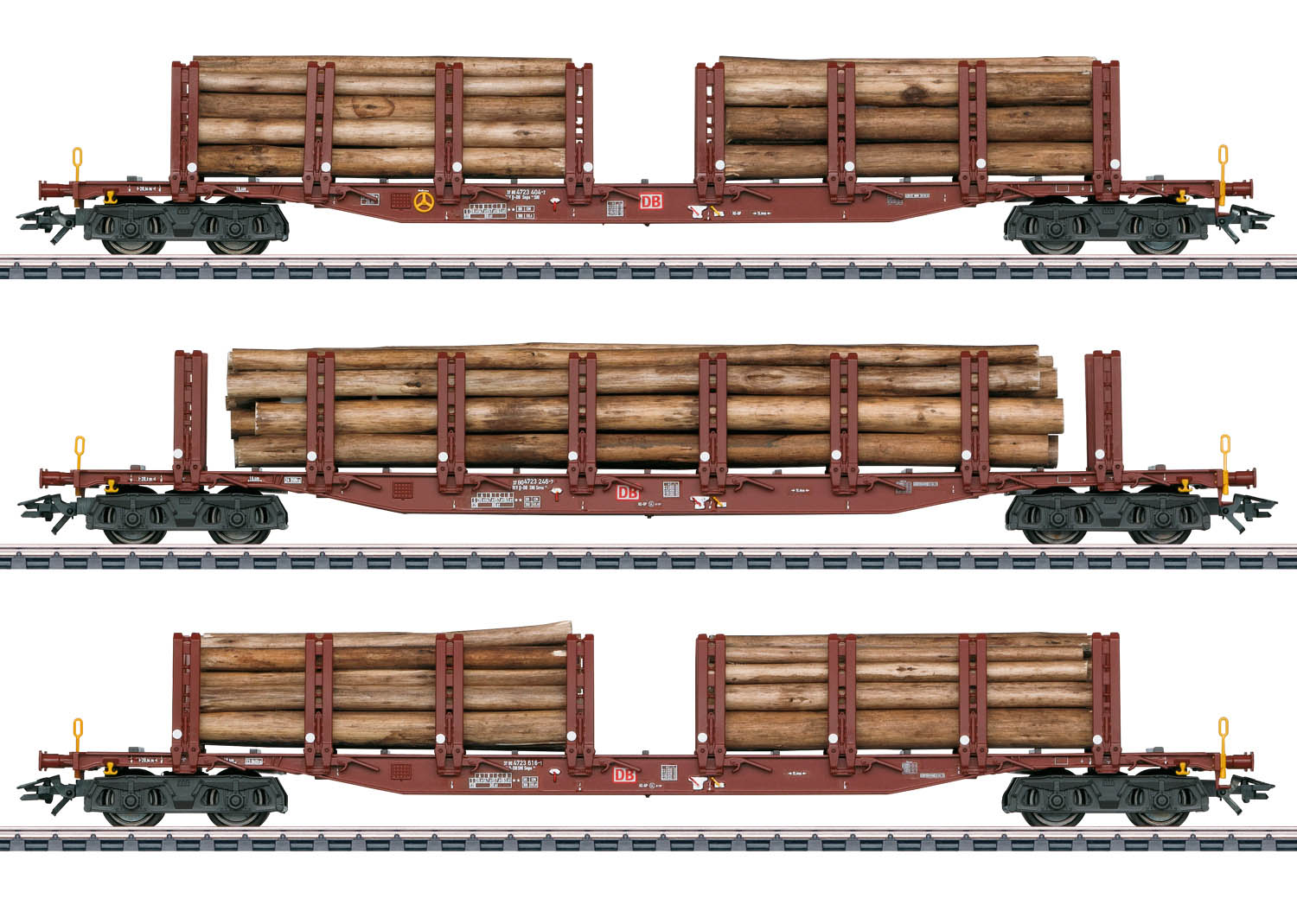 Fein detaillierte, feststehende Doppelrungen mit Spannhebeln. Farblich abgesetzte Ladefläche. Zwei Wagen mit je zwei Holzstapeln und ein Wagen mit einem langen Holzstapel beladen. Wagen einzeln verpackt. Gesamtlänge über Puffer ca. 72 cm. Gleichstromradsatz E700580.