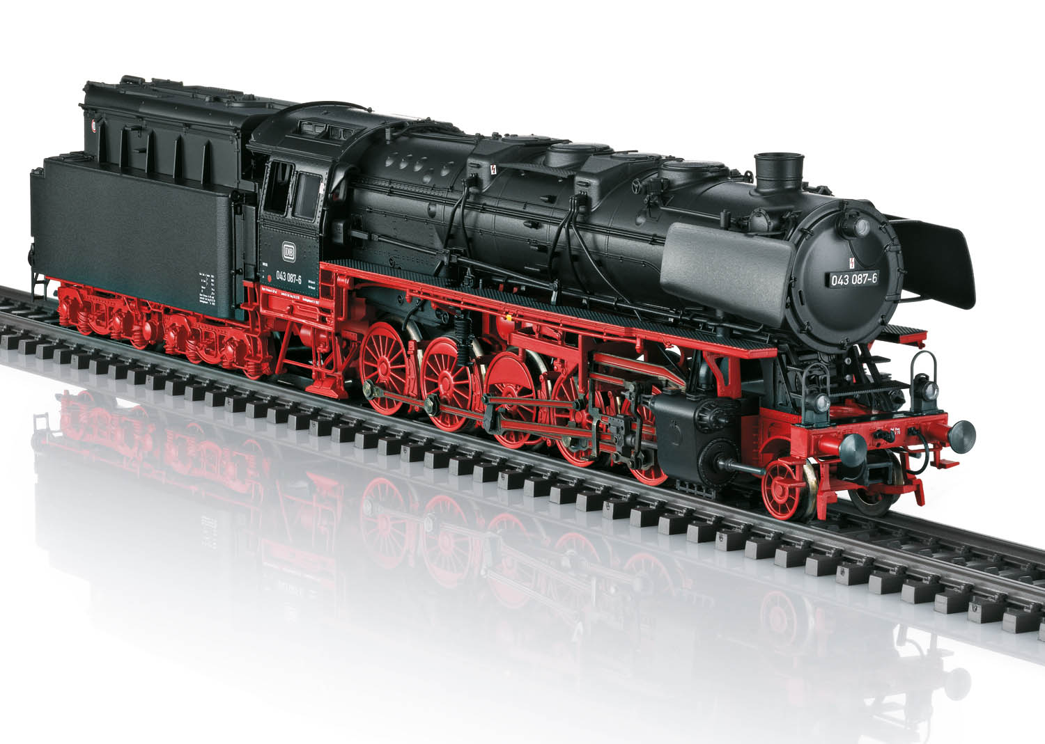 Vorbild: Schwere Güterzug-Dampflokomotive Baureihe 043, mit Öl-Tender der Einheitsbauart 2´2´T34 der Deutschen Bundesbahn (DB). Schwarz/rote Grundfarbgebung. Führerhaus mit zwei seitlichen Fenstern, mit Witte-Windleitblechen der Regelausführung, Vorlauf-Radsatz mit Speichenrädern, ohne Rauchkammer-Zentralverschluss, mit Indusi-Magneten beidseitig. Lok-Betriebsnummer 043 087-6. Betriebszustand um 1971.
