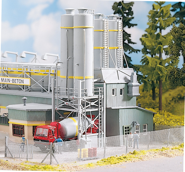 Das Ziel vieler Modellbahner: Endlich ein Betonwerk für die PIKO-Zementsilowagen! Mit dem H0-Bausatz nach dem Vor-bild der Firma Main-Beton geht dieser Wunsch in Erfüllung. In den Silos werden die verschiedenen Sorten an Fertigbeton gelagert. Sie können von dort mit den Mischfahrzeugen abgeholt werden.