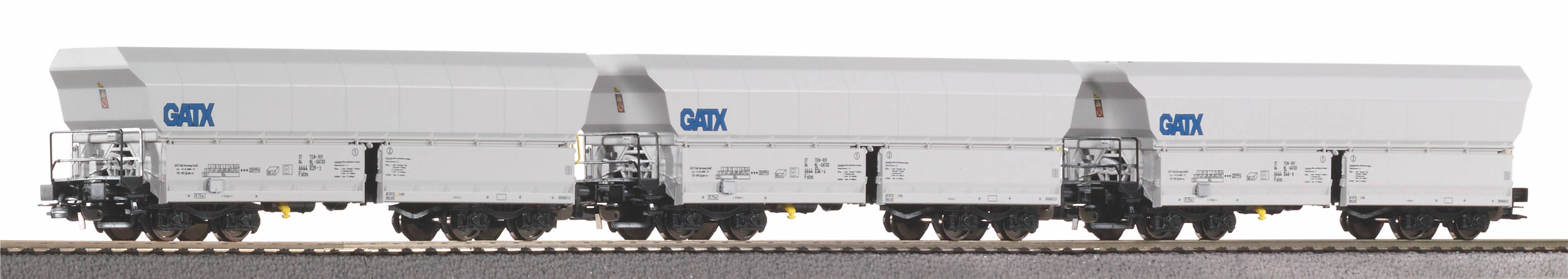 Neuheit 2022: Dreierset bestehend aus drei Schüttgutwagen vom Typ Falns des EVUs GATX. Bei den Wagenmodellen können die Entladeklappen mit der Entladebühne (Art.-Nr. 61122) betätigt werden. Die Wagen haben unterschiedliche Betriebsnummern