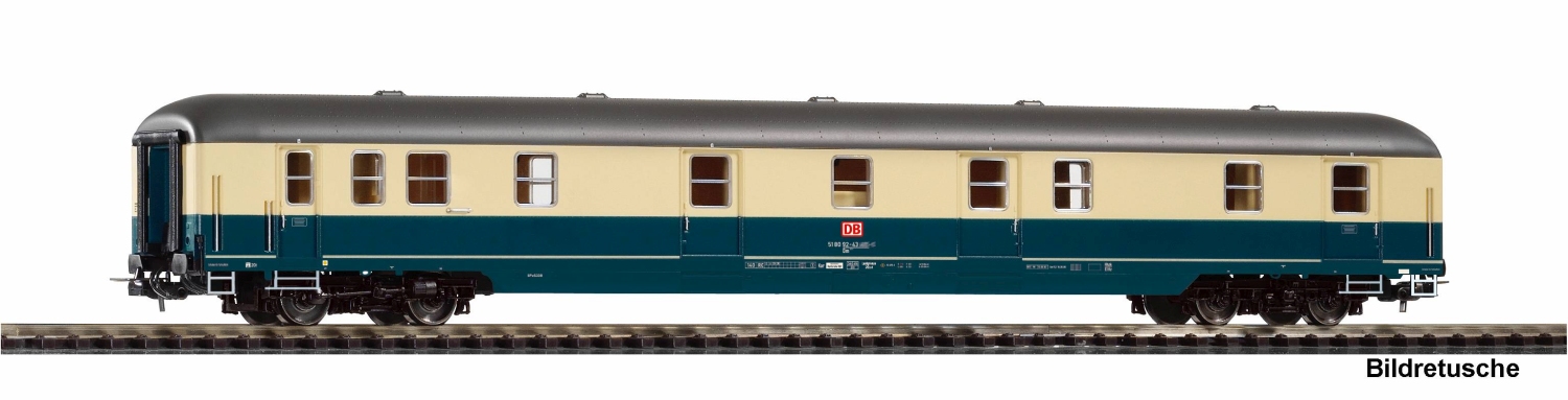Farbvariante des Packwagens Dms 903 der Deutschen Bahn AG in beigeblauer Farbgebung und DB AG Keks in der Epoche V