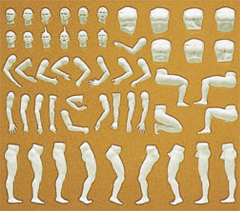 6 unbemalte Miniaturfiguren, Einzelteile aus Polystyrol, Materialfarbe weiß