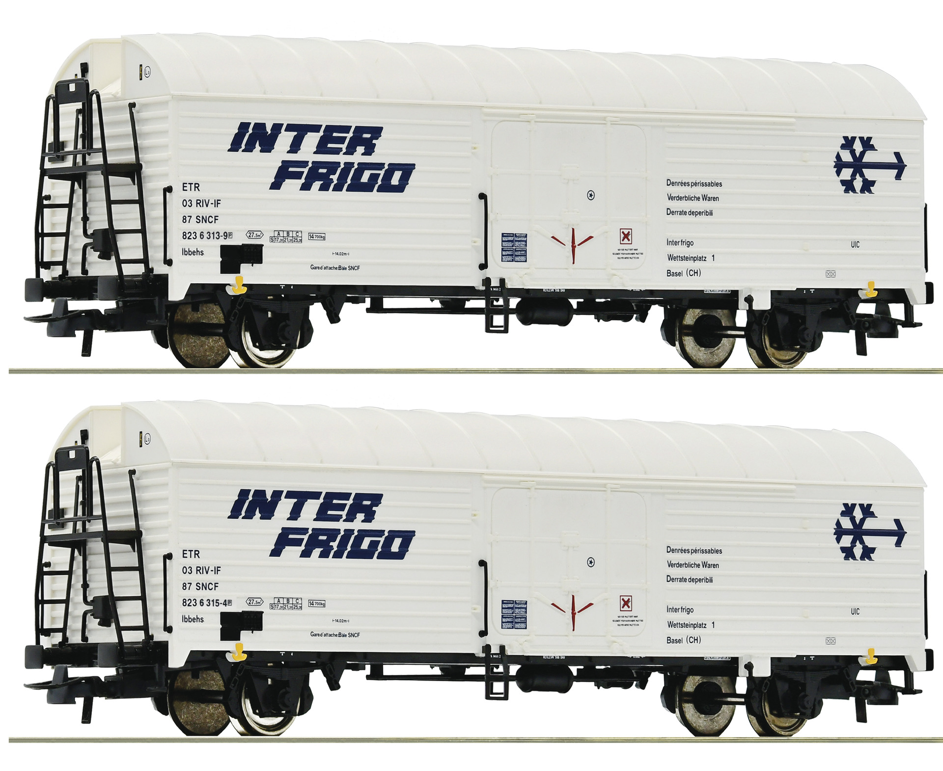 Wagenset bestehend aus zwei Kühlwagen „Interfrigo“, Gattung Ibbehs, eingestellt bei den Französischen Staatseisenbahnen.