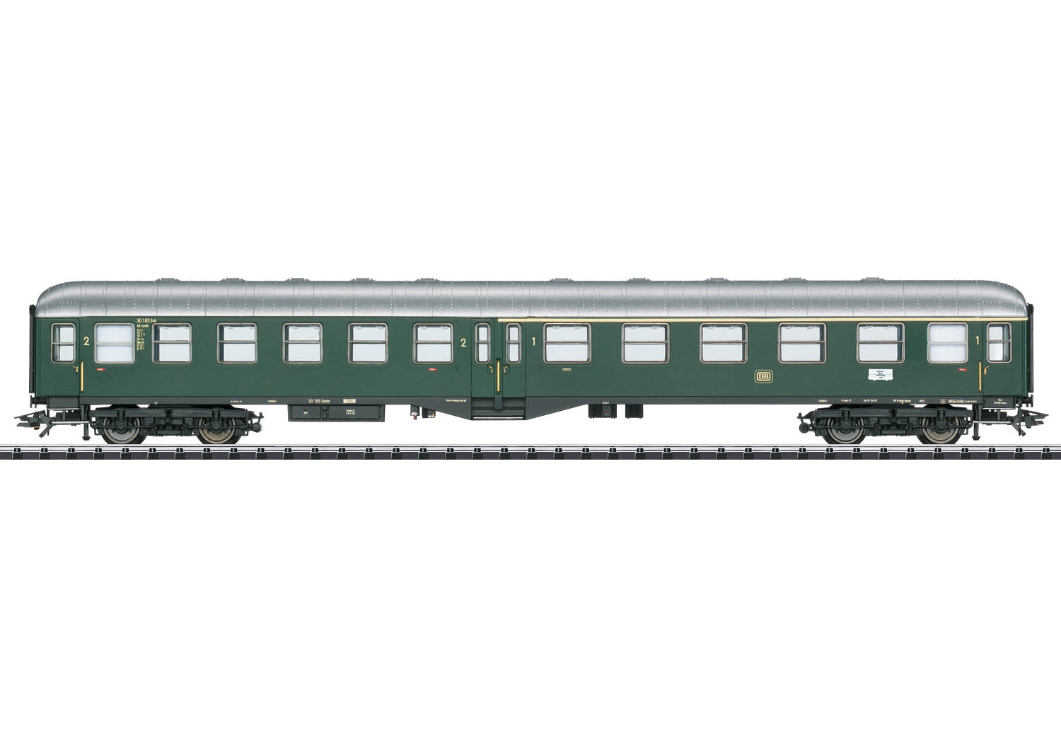 Modell: Serienmäßig eingebaute LED Innenbeleuchtung und Strom führende Kupplungen. Die Innenbeleuchtung funktioniert im Verbund mit dem Mitteleinstiegs-Steuerwagen und kann über einen Decoder im Steuerwagen digital ein- und ausgeschaltet werden. Stirnseitig rot transparente Schlusslicht-Einsätze an den Wagenenden. Typspezifisch gestalteter Unterboden. Drehgestelle Bauart Minden-Deutz schwer mit Doppelklotzbremse. Befahrbarer Mindestradius 360 mm. Für die Präsentation in einer Vitrine liegen WC-Fallrohre und Wendezugsteuerleitungen als separat ansteckbare Teile bei. Länge über Puffer 28,2 cm.