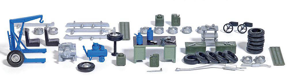 Kleinteile für die Autowerkstatt mit Reifen, Felgen, Ölkannen, Rücksitzbank, Reifenmontiermaschine und vieles mehr.