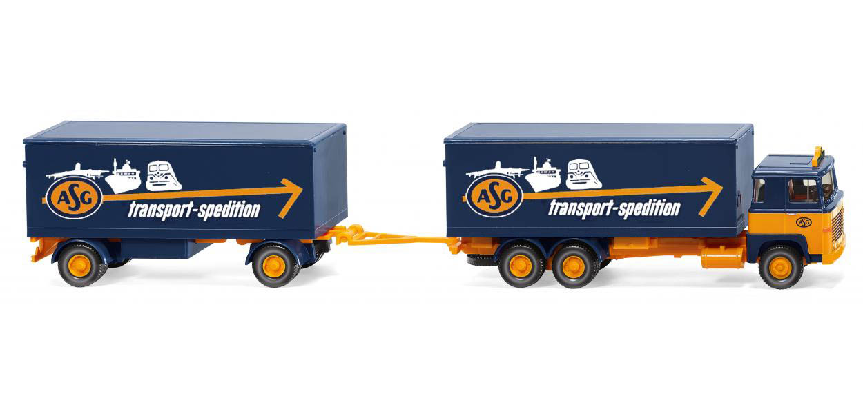 Zugfahrzeug mit saphirblauem Fahrerhaus, Einstieg, Kotflügeln und Koffer. Melonengelbes Dachschild mit blauem ASG-Schriftzug bedruckt. Kühlergrill melonengelb mit saphierblau bedruckten Grillrippen. Inneneinrichtung rehbraun. Fahrgestell mit Kardanteil sowie Felgen melonengelb. Blinker orange bedruckt, frontseitig Scania-Schriftzug aufgedruckt. Seitlich gesilberte Türgriffe, ASG-Logo auf den Türen aufgedruckt. Frontscheinwerfer per Hand gesilbert. Rücklichter rot bedruckt. Seitliche Kofferbedruckung mit Schriftzug Transportspedition und Symbolen sowie melonengelbem ASG-Logo und Pfeiloptik. Anhänger mit melonengelbem Fahrgestell und Drehschemel sowie Schwingachse, aber auch Deichsel und Felgen. Seitliche Verdeckbedruckung mit Schriftzug Transportspedition und Symbolen sowie melonengelbem ASG-Logo und Pfeiloptik.