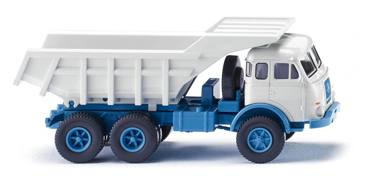 Henschel hatte bis zum Ende der Kasseler Lkw-Ära die Bicolor-Gestaltung konsequent gepflegt – vor allem dann, wenn es um die werksseitige Präsentation oder die zahlreichen Messen im In- und Ausland ging. So wurde auch der Henschel Muldenkipper HS3-180 in der zweifarbigen Markengestaltung von Papyrusweiß und Hellblau vorgestellt und angeboten. WIKING miniaturisiert das damalige Markendesign und setzt zugleich die zugehörige Detaillierung um, zumal die Henschel-Front – vor allem durch den markanten Kühlergrill der Markenfamilie mit Haubenandeutung – an Charakter gewinnt. Die feine Gitterstruktur wird bei den Formengravuren ebenso umgesetzt wie der markante Henschel-Stern und die verschiedenen Zierleisten, die dem ansonsten schlichten Blech einst Wertigkeit gaben. Am Dach befinden sich erhabene Lüftungsklappen sowie optional das serienübliche Signallicht. Der Henschel-Muldenkipper reiht sich nahtlos in die Henschel-Modelle von WIKING ein, die in jüngster Vergangenheit den authentischen Markenauftritt zeitgenössisch zur Schau getragen haben.