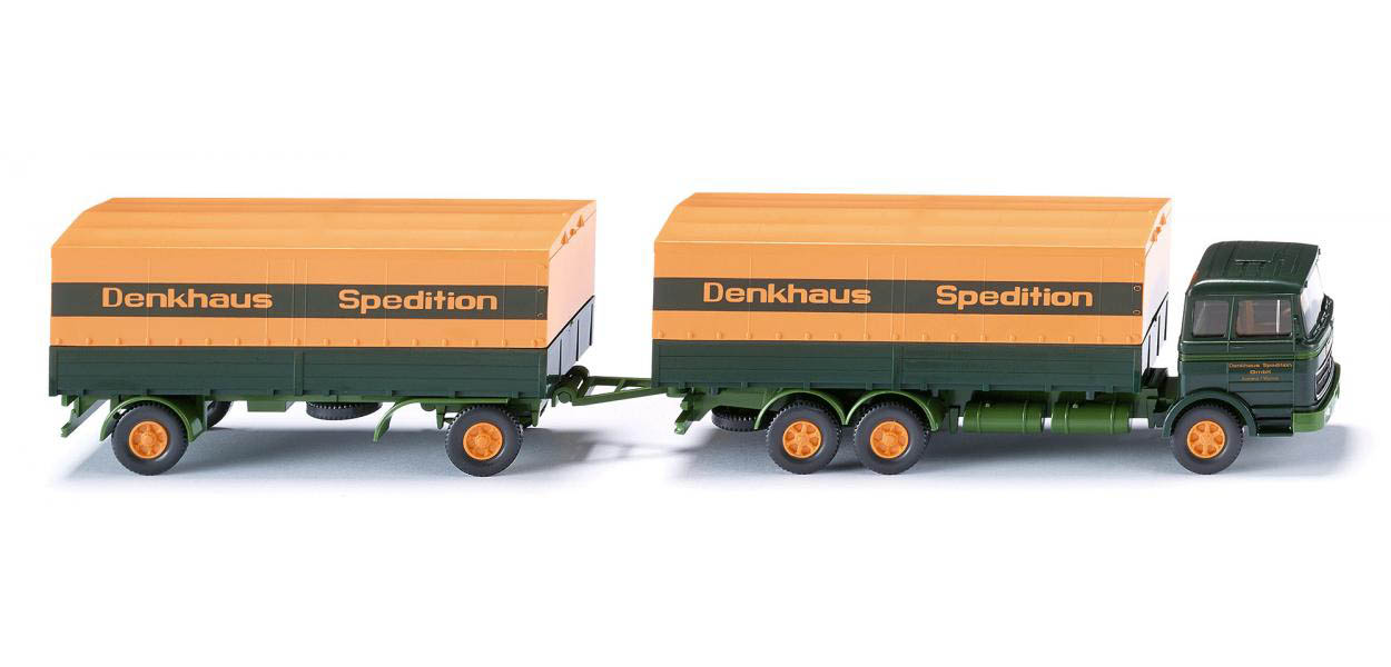 Zugfahrzeug mit Fahrerhaus und Pritsche tannengrün. Stoßstange sowie Fahrgestell, hintere Doppelkotflügel und Kardanteil hellgrün. Inneneinrichtung olivbraun. Kühlergrill schwarz mit gesilbertem Zierrat und Mercedes-Benz-Stern. Felgen und Plane sonnengelb. Fahrerhaus mit oben umlaufendem Zierstreifen in hellgrün. Stirnbedruckung mit Denkhaus-Schriftzug. Seitliche Kabinenbedruckung mit Hinweis auf Denkhaus Spedition GmbH Koblenz/Worms. Planenbedruckung mit tannengrünem Streifen und Negativ-Schriftzug Denkhaus Spedition. Frontscheinwerfer per Hand gesilbert. Anhänger mit tannengrüner Pritsche. Fahrgestell mit hinterem Kotflügel und Deichsel hellgrün. Verdeck und Felgen sonnengelb. Planenbedruckung mit tannengrünem Streifen und Negativ-Schriftzug Denkhaus Spedition.