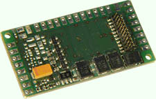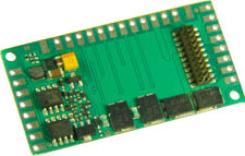Adapter-Platine für "21MTC"-Decoder; der Decoder wird in die Stiftleiste des Adapters eingesteckt. Über große Löt-Pads kann die Verdrahtung innerhalb der Lok komfortabel vorgenommen werden. Die Adapter-Platine ADAMTC ist mit einem Gleichrichter ausgestattet, der den Gleichrichter des Decoders entlastet, wodurch dieser weniger Verlustwärme erzeugt und dafür mehr Leistung abgeben kann.