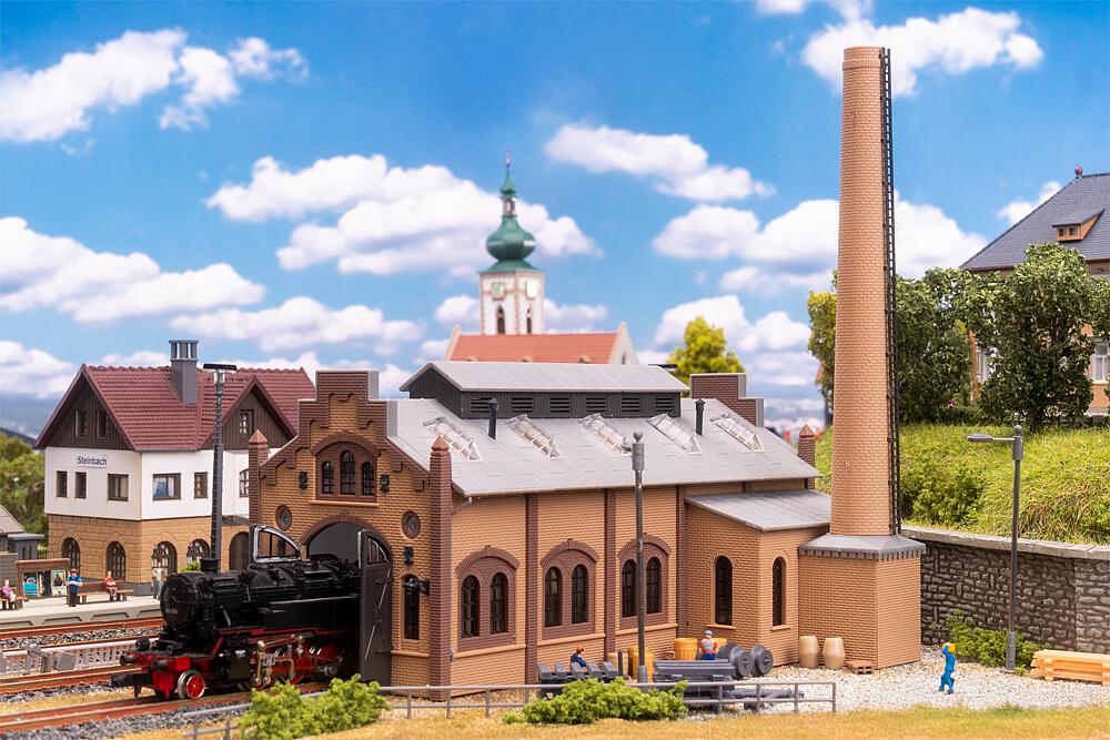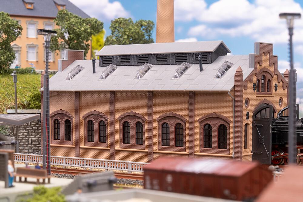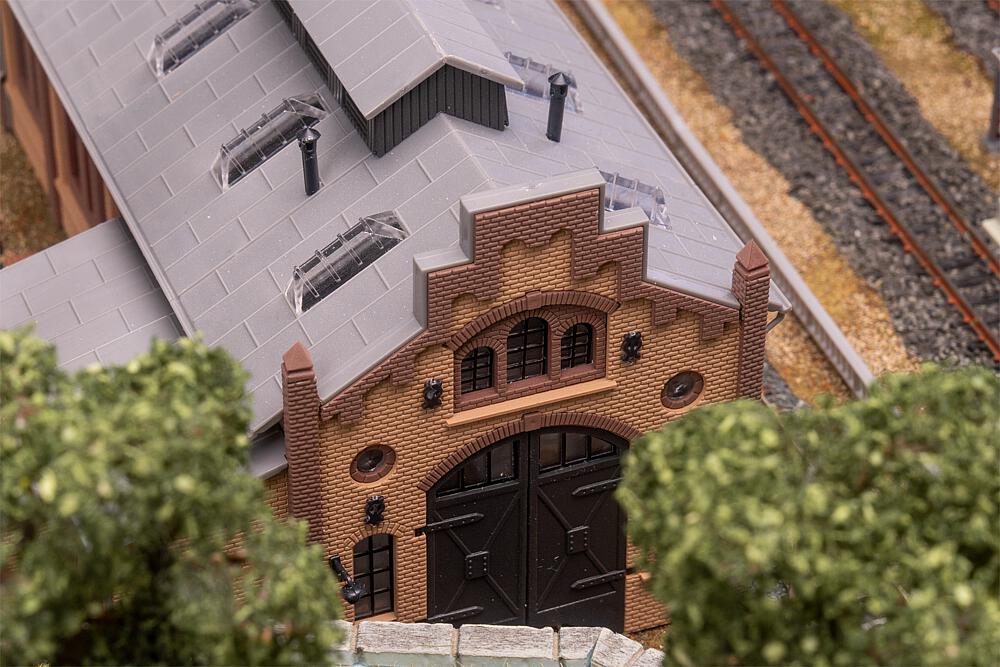 Vielseitig einsetzbar als Lokschuppen, Werkstatt oder Schlosserei – mit Durchfahrtstoren vorne und hinten. Die Modulbauweise lässt eine variable Gebäudeverlängerung und den Bau mehrerer Modelle nebeneinander zu. Kamin vorbereitet für Rauchgeneratoren, für besonders realistische Miniaturszenen.