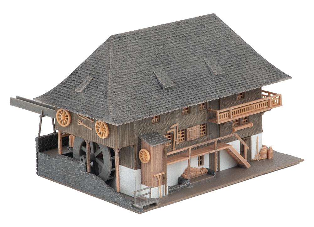 Ein echtes Original! Diese Schwarzwälder Getreidemühle liegt idyllisch im Jostal bei Titisee-Neustadt. Erbaut wurde sie 1772 und ist bis heute im Familienbesitz. Die Mühle wird oberschlägig über ein Wasserrad angetrieben, verfügt über ein Mahlwerk mit Steingang und alle Voraussetzungen, um Öl zu pressen oder Korn zu mahlen. Neben der Mühle bietet das Gebäude einen zusätzlichen Wohnteil. Eine Figur in traditioneller Tracht erweckt die Mühle zum Leben. Das Modell lässt sich zudem mit dem Bastelmotor (Art. 180629) antreiben, dieser liegt jedoch nicht bei.