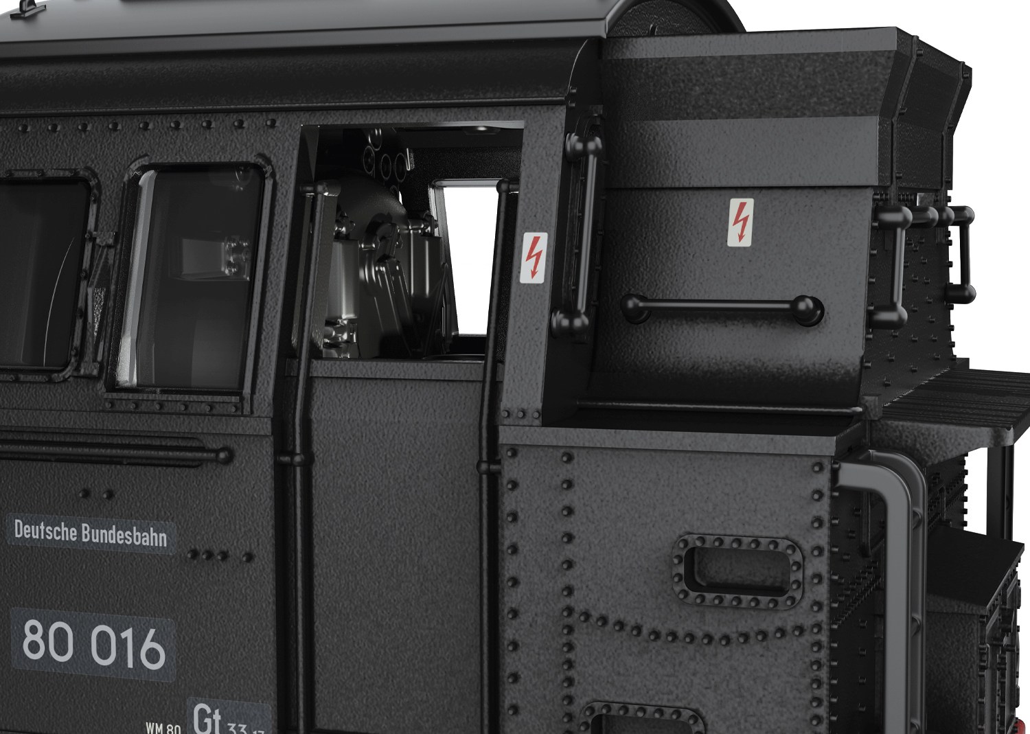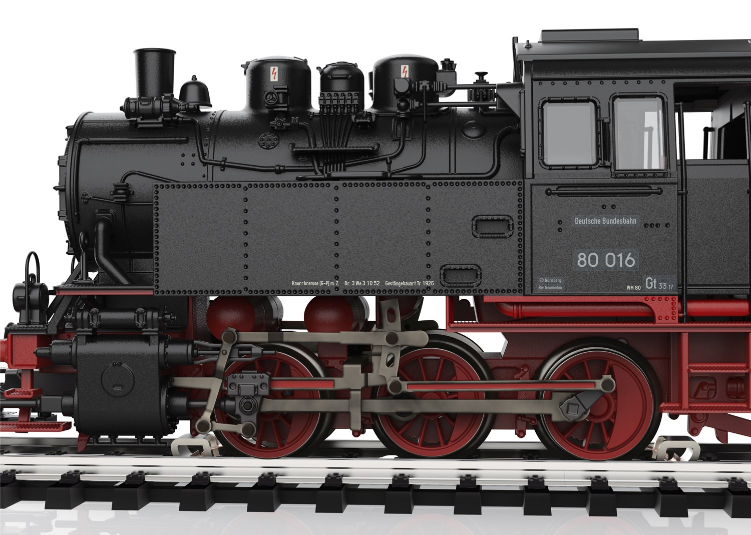 Vorbild: Tenderlokomotive Baureihe 80 der Deutschen Bundesbahn. Ausführung mit drei Kesselaufbauten, Läutewerk und Turbodynamo links, Rauchkammertüre ohne Zentralverschluss mit Nummernschild mittig. Tiefschwarze Grundfarbgebung. Betriebsnummer 80 016. Betriebszustand um 1953.