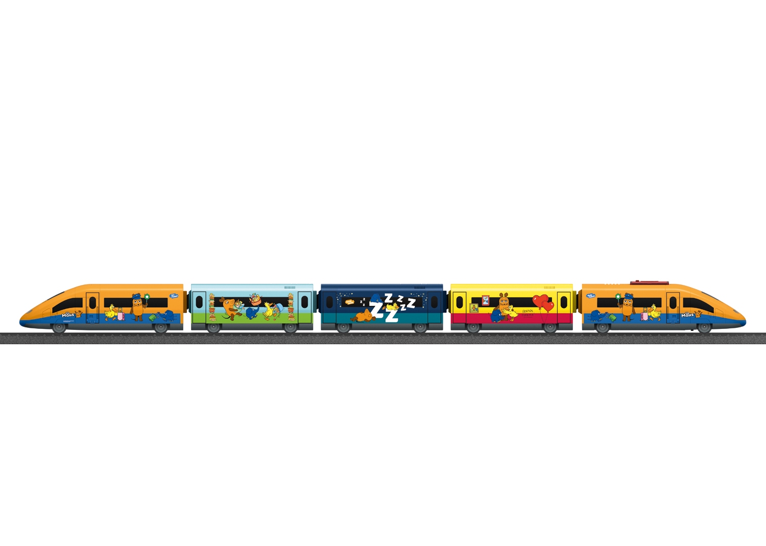 Vorbild: Einem ICE 3 nachempfundenen Hochgeschwindigkeitszug in einer kindlichen Maus-Gestaltung.