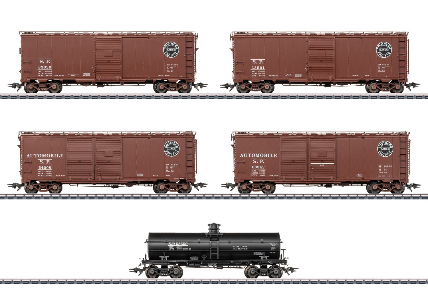 Set bestehend aus fünf US-Güterwagen unterschiedlicher Bauarten der Southern Pacific. Zwei Single-Door Boxcars, zwei Double-Door Boxcars (Automotive Car) und ein Tankcar. Betriebszustand um 1948.