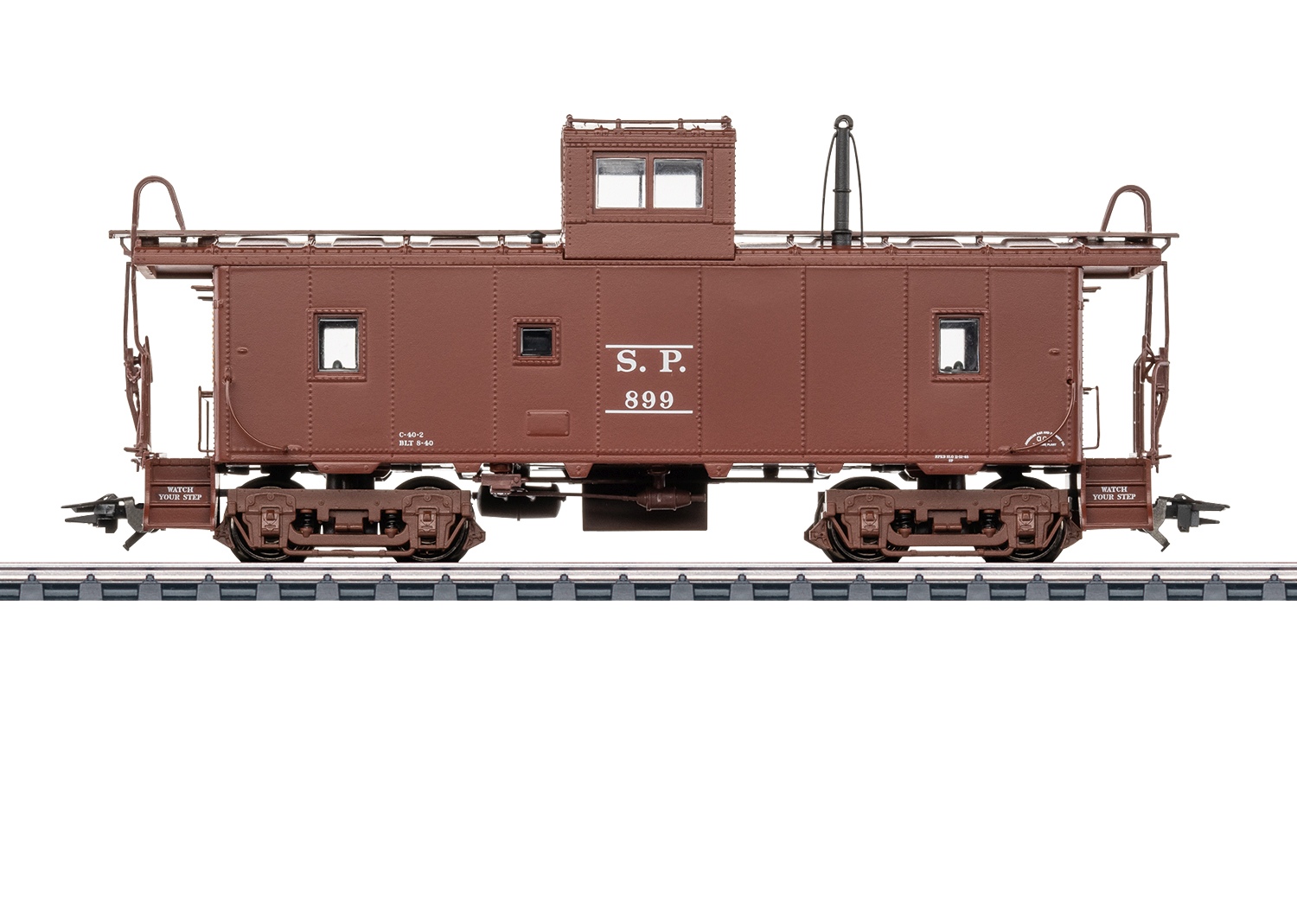 Güterzug-Begleitwagen Caboose der Southern Pacific. Ausführung mit mittiger Dachkanzel. Kastanienbraune Grundfarbgebung. Betriebszustand um 1948.