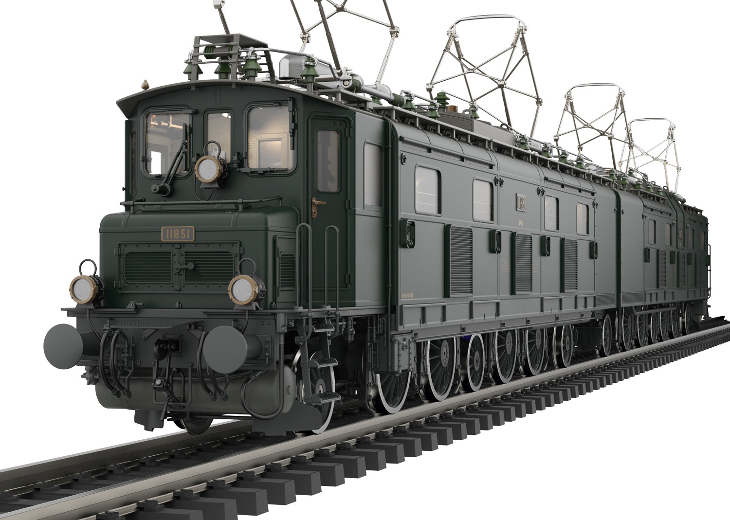 Elektrolokomotive Serie Ae 8/14 Nr. 11851 der Schweizerischen Bundesbahnen (SBB) in tannengrüner Grundfarbgebung ihres Auslieferungszustandes von 1932. Die Lok war bis 1938 in diesem Zustand in Betrieb. Epoche II.