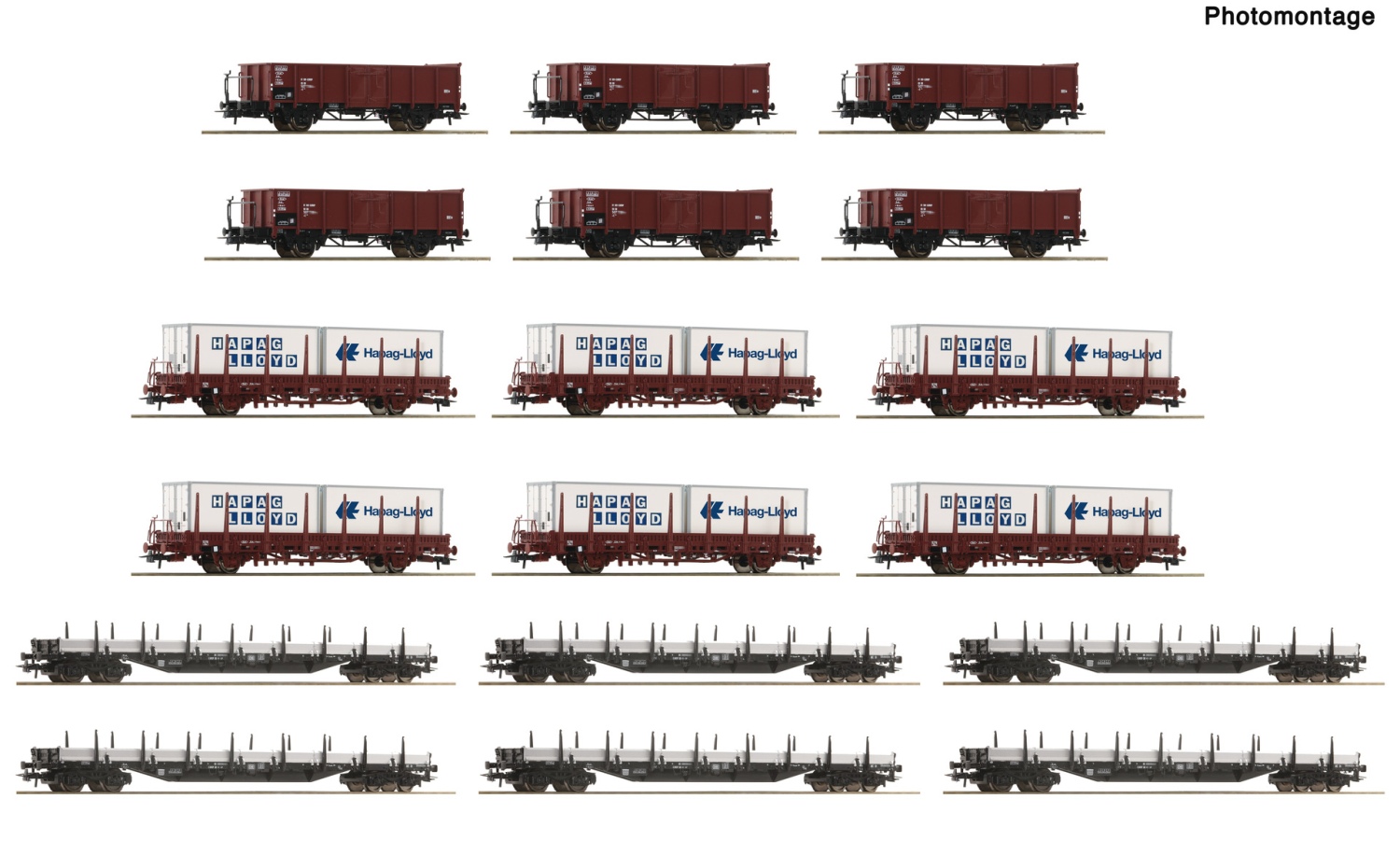 Bestehend aus zwei offenen Güterwagen, Gattung E 040, zwei 2-achsigen Rungenwagen, Gattung Kbgs und zwei 4-achsigen Rungenwagen, Gattung Res.