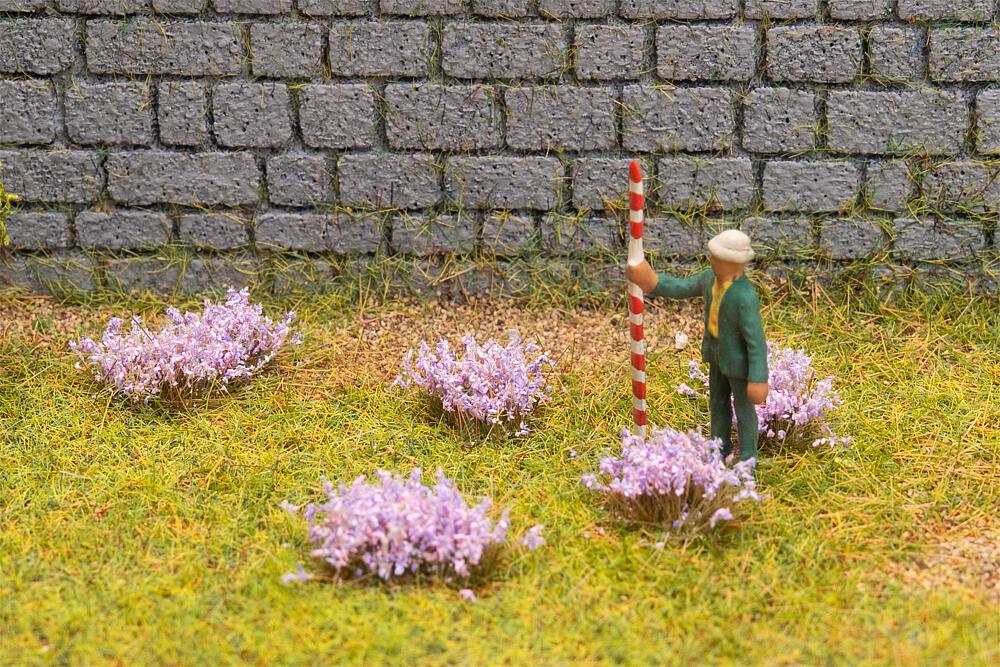 Kleine, unregelmäßige Blütenbüschel in Lila zum Aufkleben – perfekt, um Wege, Gärten, Parks oder Wiesen zu beleben und der Modelllandschaft eine natürliche, detailreiche Note zu verleihen.