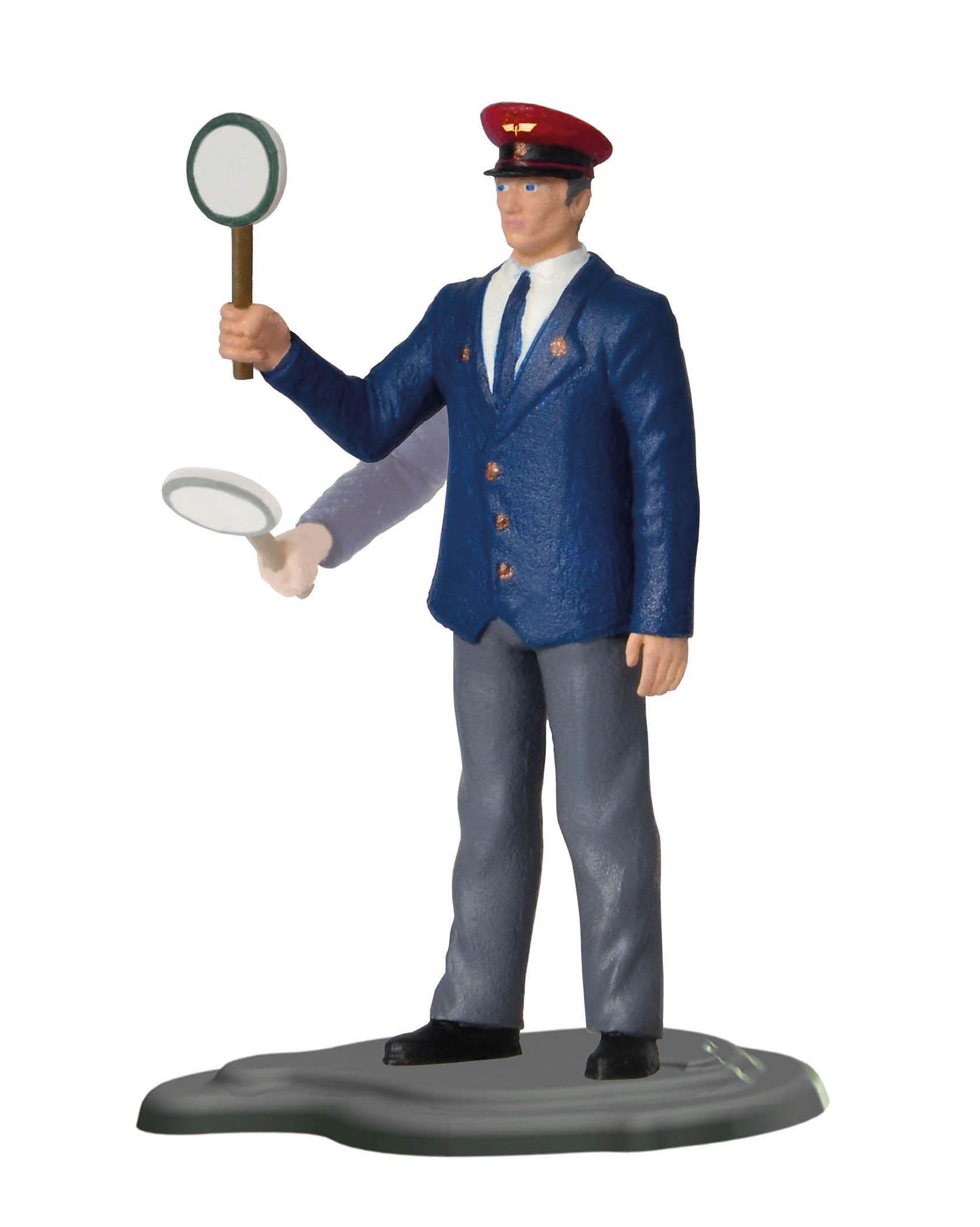 Der Fahrdienstleiter hebt und senkt die Kelle und gibt das Signal zur Abfahrt.
