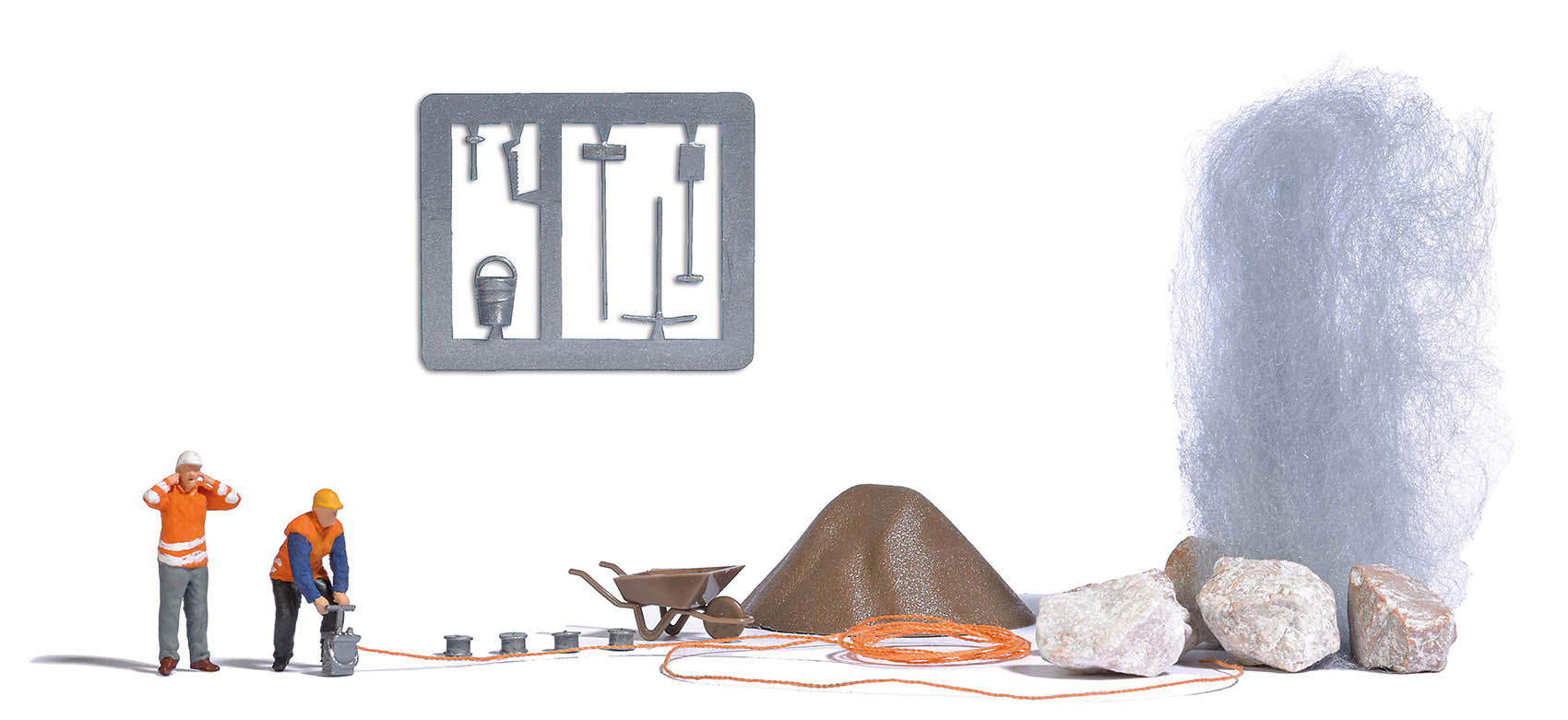 ACTION SET mit einem Sprengmeister, der mit einer Zündmaschine eine Sprengung auslöst und Mitabeiter, der sich dabei die Ohren zuhält. Mit Werkzeugen, Schubkarren, Felsbrocken, Seilen, Rauchschwaden und Sandhaufen.