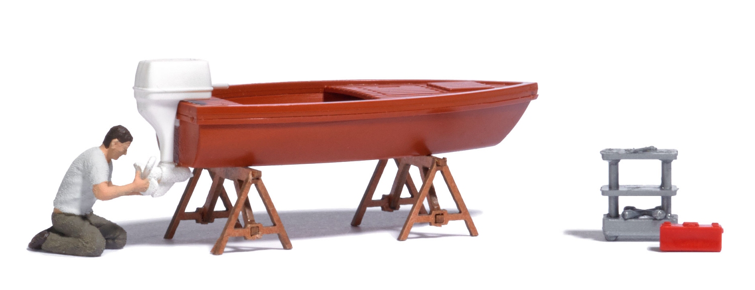 Bootsmechaniker, der einen Außenbordmotor instand setzt. Mit Boot, Reparaturböcken, Werkzeugwagen und Werkzeugkiste.