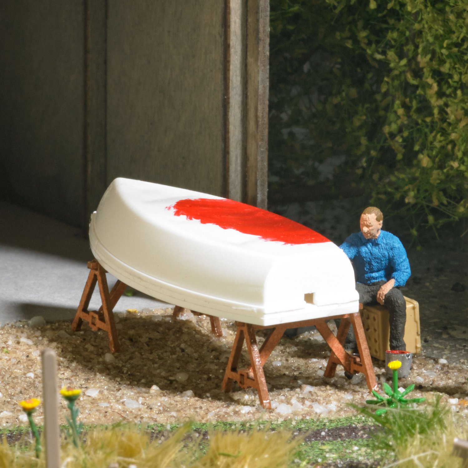 Maler, der ein Boot neu anstreicht. Mit Motorboot, Reparaturböcken, Bierkisten, Werkzeugkiste und Farbeimer.