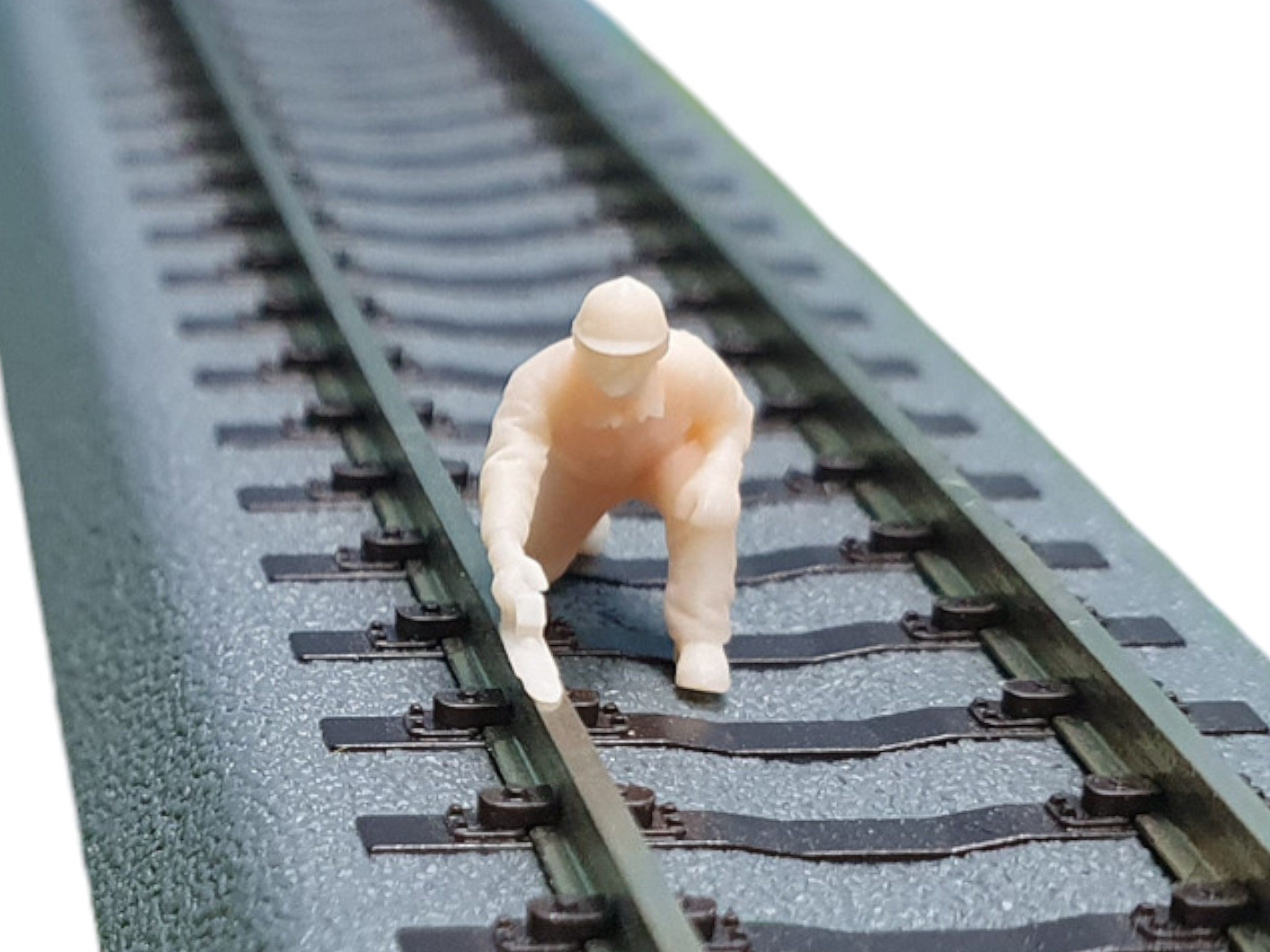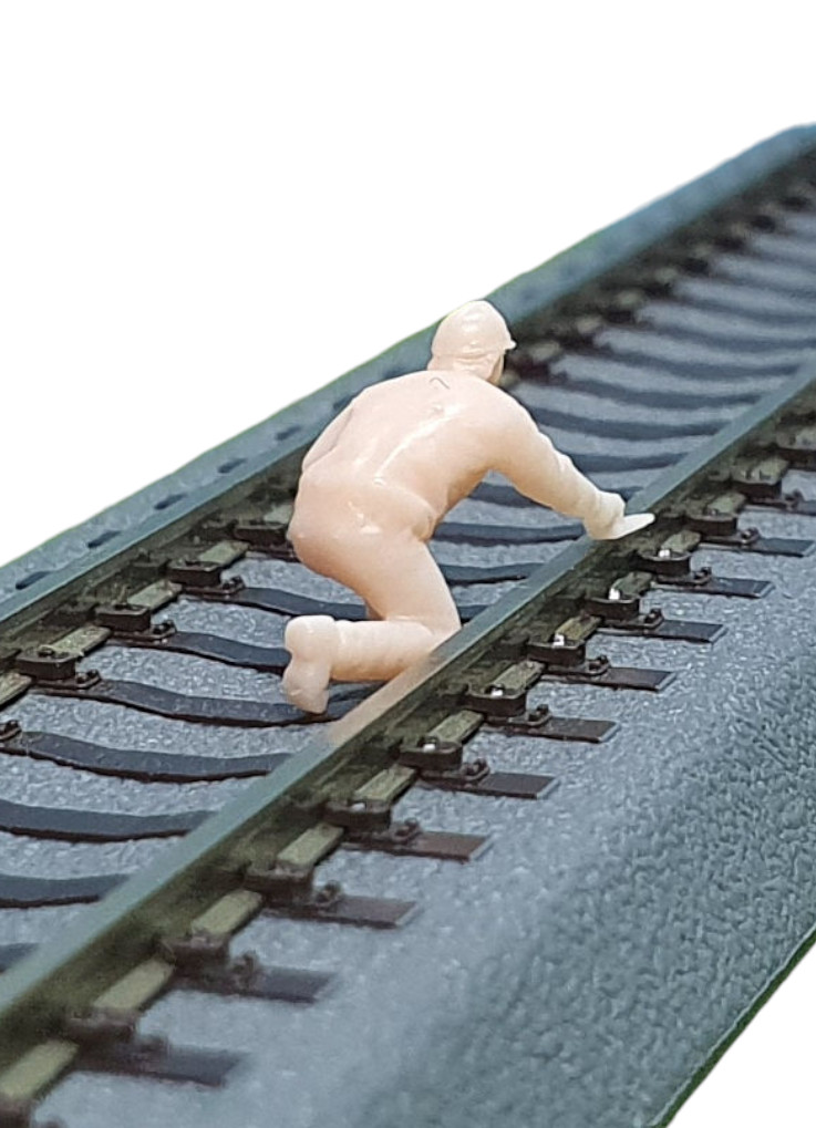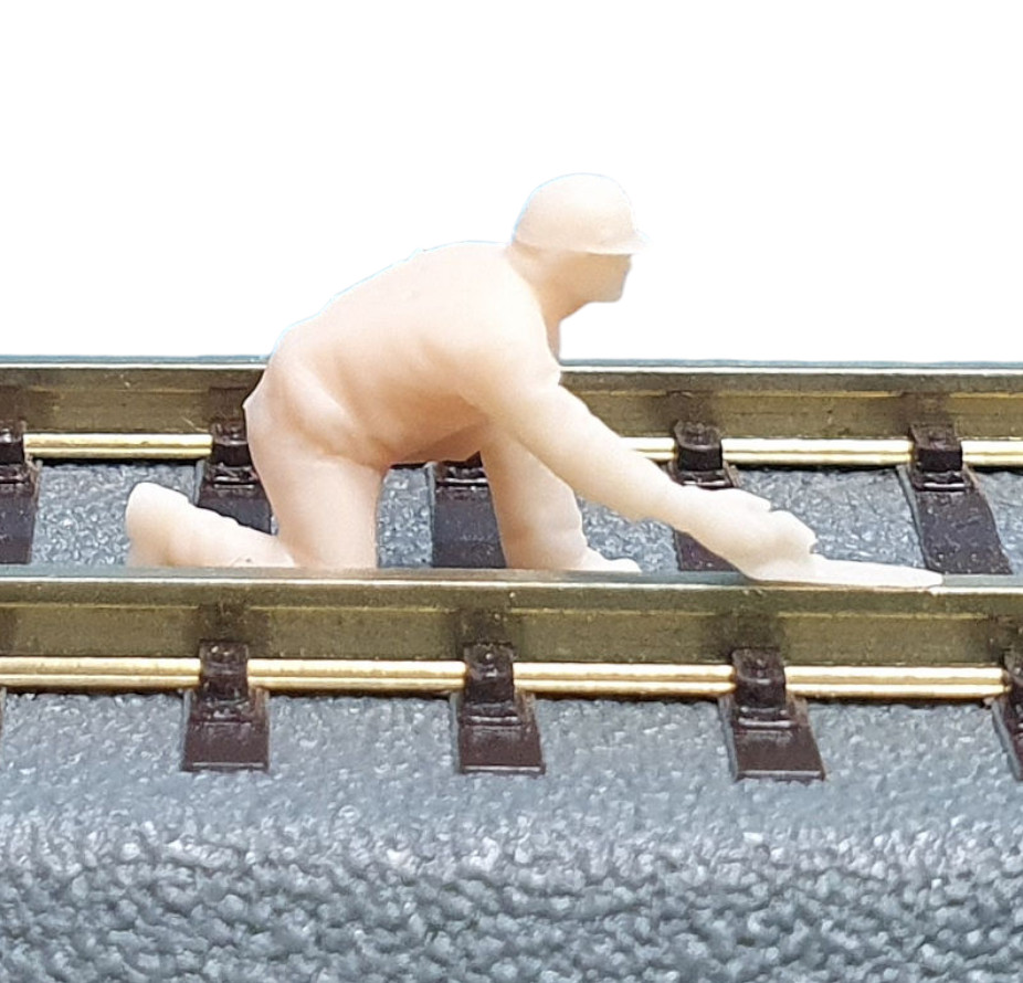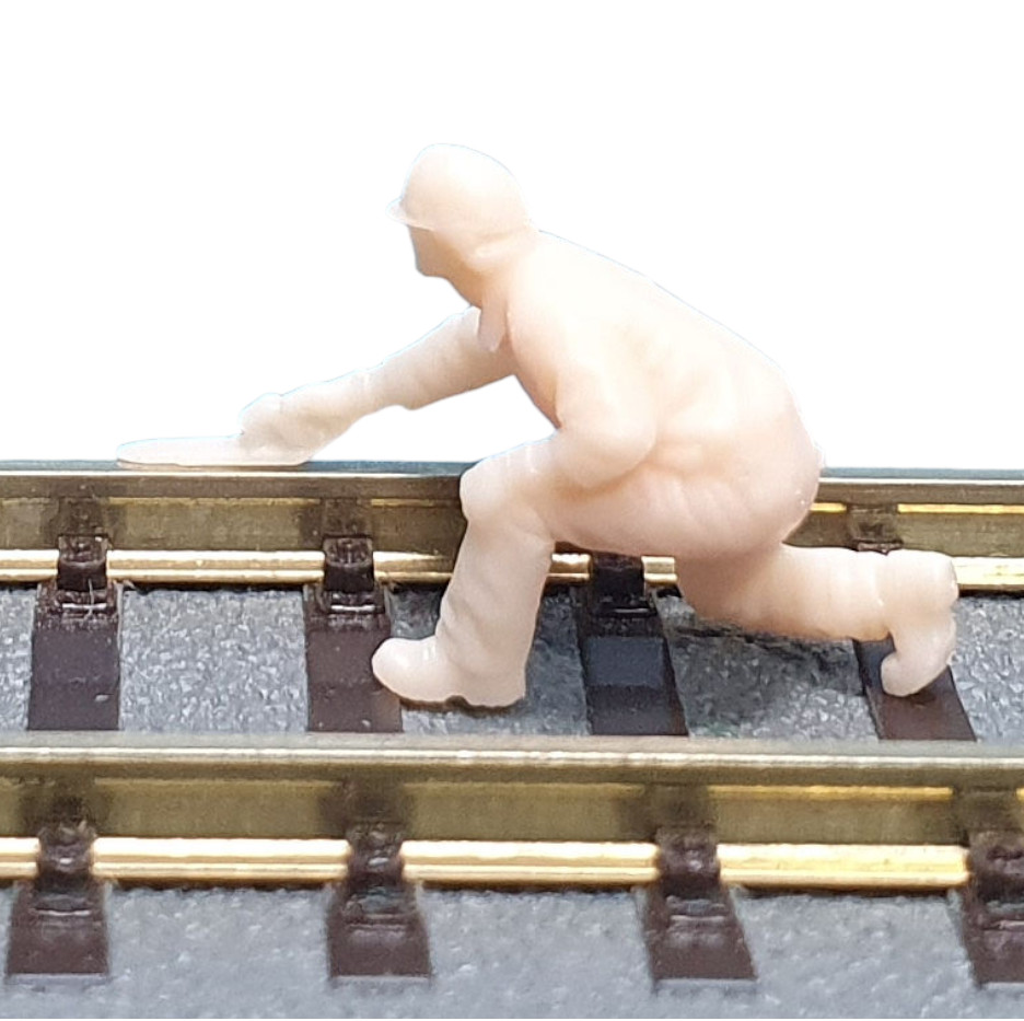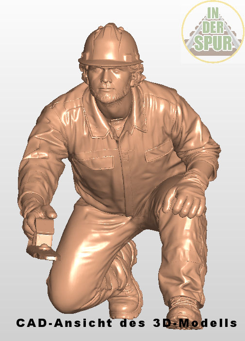 Rangierer „Piet“ mit Hemmschuh (Bremsschuh) – eine detailreich gestaltete Figur für Ihre TT-Modellbahn. Die In-der-Spur-Figuren zeichnen sich durch eine besonders vorbildnahe Körperhaltung und fein ausgearbeitete Details aus – perfekt für realistische Szenerien im Maßstab 1:120.