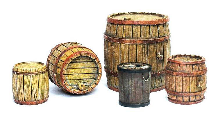 5 Holzfässer in unterschiedlichen Größen. Nicht coloriert. Ideal für den Dioramenbau.